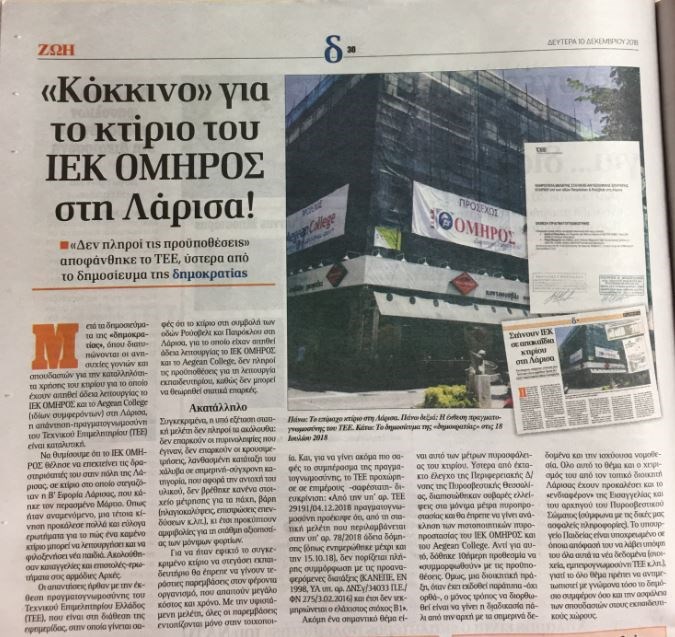 Μετά τα δημοσιεύματα της εφημερίδας ”Δημοκρατία” όπου διατυπώνονται οι ανησυχίες γονιών και σπουδαστών για την καταλληλότητα χρήσης του κτιρίου για το οποίο έχουν αιτηθεί άδεια λειτουργίας το ΙΕΚ Όμηρος και το Aegean College (ιδίων συμφερόντων) στη Λάρισα, η απάντηση- πραγματογνωμοσύνη του Τεχνικού Επιμελητηρίου Ελλάδος (ΤΕΕ) είναι καταλυτική.