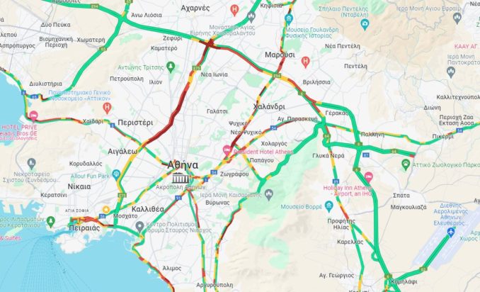 «Κόκκινος» έχει βαφτεί ο χάρτης της κίνησης σε πολλά σημεία. Κηφισός και έξοδος της Εθνικής Οδού Αθηνών – Κορίνθου αντιμετωπίζουν προβλήματα, ενώ «ασφυξία» επικρατεί στα δύο ρεύματα της Εθνικής Οδού Αθηνών – Λαμίας.