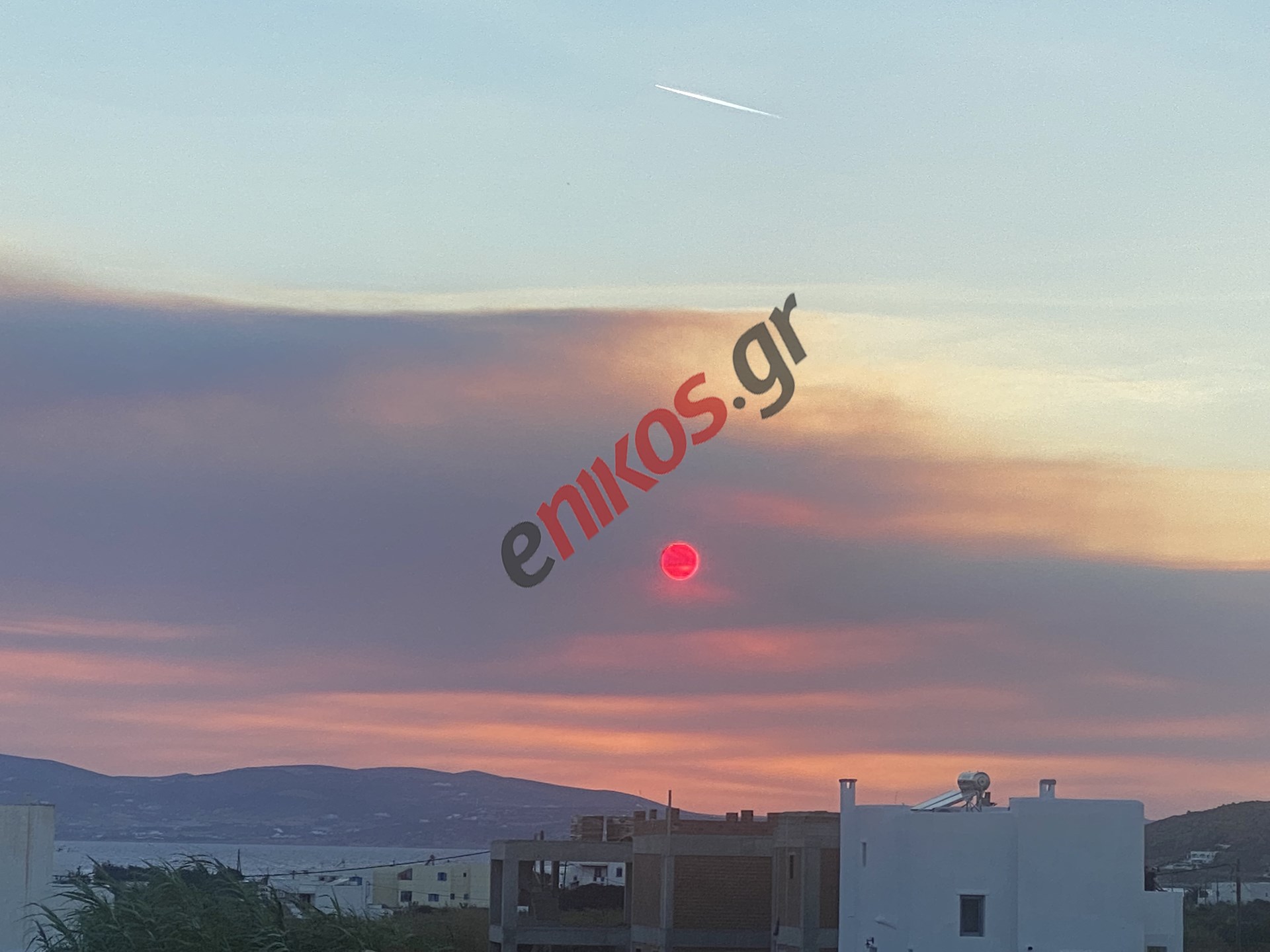 Μέχρι το μαγευτικό νησί της Νάξου έχουν φθάσει οι καπνοί των πυρκαγιών που κατακαίνε σε Εύβοια και Αττική. Χαρακτηριστικές, μάλιστα, είναι οι εικόνες λίγο πριν δύσει ο ήλιος, όπου είναι κατακόκκινος.