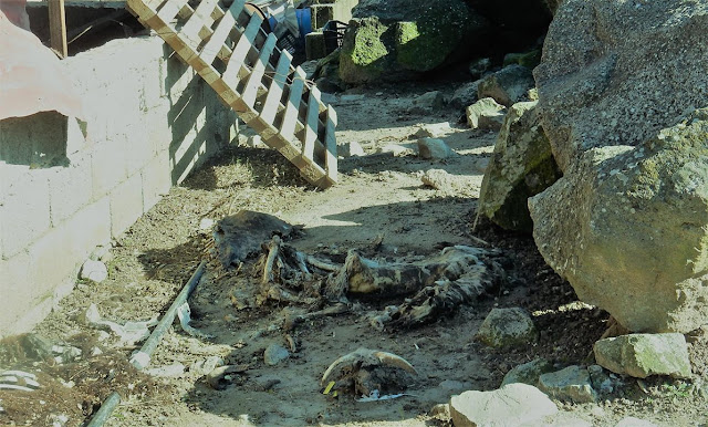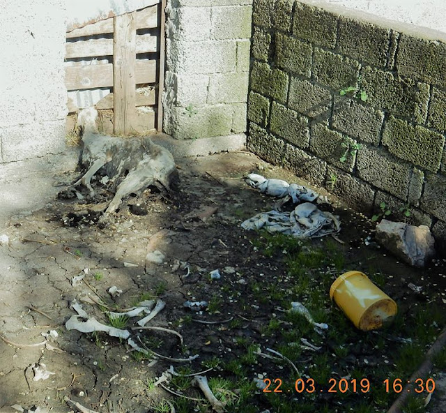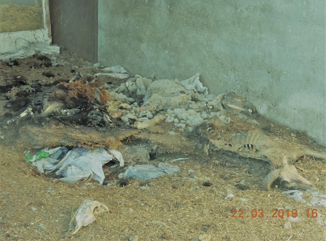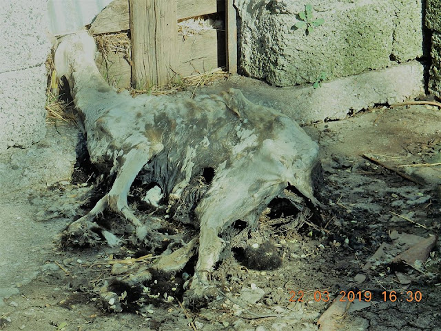 Όμως, αρκεί μια απλή αντιπαραβολή των φωτογραφιών της 22ης Μαρτίου (που εστάλησαν) με αυτές της 26ης Μαρτίου 2019 (που ελήφθησαν επί των ίδιων ακριβώς σημείων) για να γίνει σαφής η προσπάθεια των ιδιοκτητών/υπευθύνων της κτηνοτροφικής εγκατάστασης, να καλυφθεί το τερατώδες έγκλημα έναντι των παραγωγικών αυτών ζώων, τα οποία όχι μόνο εγκαταλείφθηκαν για να πεθάνουν από την πείνα και την δίψα, αλλά και αφέθηκαν να αποσυντίθενται στα σημεία όπου πέθαναν.
