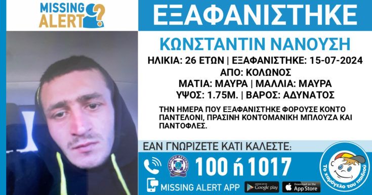 Συναγερμός έχει σημάνει στις αρχές για την εξαφάνιση ενός 26χρονου από την περιοχή του Κολωνού.
