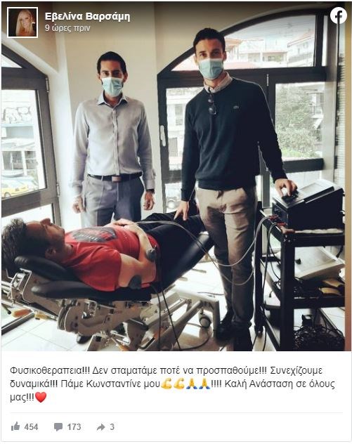«Φυσικοθεραπεία!!! Δεν σταματάμε ποτέ να προσπαθούμε!!! Συνεχίζουμε δυναμικά!!! Πάμε Κωνσταντίνε μου!!!! Καλή Ανάσταση σε όλους μας!!!» έγραψε στη λεζάντα της φωτογραφίας που δημοσίευσε στο Facebook η Εβελίνα Βαρσάμη.