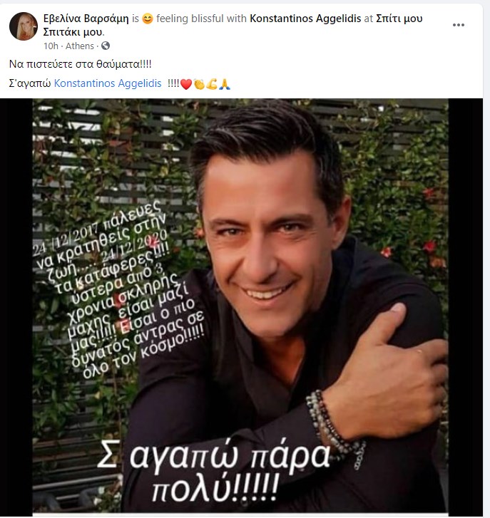 «Να πιστεύετε στα θαύματα!!!! Σ’ αγαπώ», έγραψε η Εβελίνα Βαρσάμη, ποστάροντας μια φωτογραφία του συζύγου της. Ανέτρεξε στην περίοδο που είχε γίνει το τροχαίο και μετά.