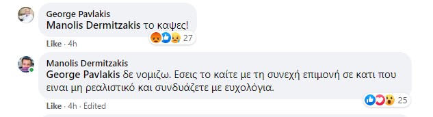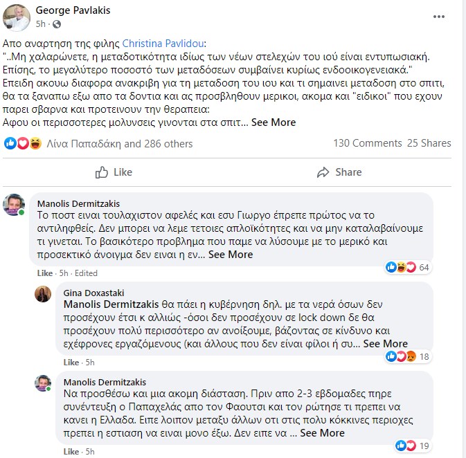 Ο Μανώλης Δερμιτζάκης απάντησε σε σχόλιο ότι “το ποστ είναι τουλάχιστον αφελές και εσύ Γιώργο έπρεπε πρώτος να το αντιληφθείς. Δεν μπορεί να λέμε τέτοιες απλοϊκότητες και να μην καταλαβαίνουμε τι γίνεται. Το βασικότερο πρόβλημα που πάμε να λύσουμε με το μερικό και προσεκτικό άνοιγμα, δεν είναι η ενδοοικογενειακή μετάδοση από μετάδοση που έρχεται από έξω αλλά η μετάδοση από άτομο μιας οικογένειας σε άτομο άλλης οικογενειας, που συναντιούνται σε κλειστούς χώρους (φίλοι, παιδια, ολόκληρες οικογένειες). Εάν αυτές οι συναντήσεις αντί να γίνουν μέσα σε κλειστό χώρο γίνονται σε ανοιχτό χώρο, τότε η μετάδοση πέφτει κατακόρυφα”. Ο κ. Παυλάκης απάντησε και στο συγκεκριμένο σχόλιο λέγοντας χαρακτηριστικά “το ΄καψες!”. Ο Μανώλης Δερμιτζάκης έδωσε συνέχεια λέγοντας ότι “δεν νομίζω. Εσείς το καίτε με τη συνεχή επιμονή σε κάτι που είναι μη ρεαλιστικό και συνδυάζετε με ευχολόγια”.