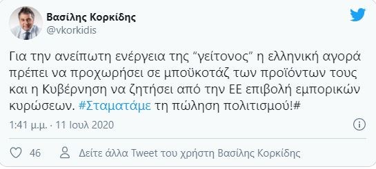 Μποϊκοτάζ στα προϊόντα από την Τουρκία προτείνει ο πρόεδρος του Εμπορικού και Βιομηχανικού Επιμελητηρίου Πειραιώς Βασίλης Κορκίδης. Σε ανάρτησή του στο twitter ο κ. Κορκίδης αναφέρει τα εξής: «Για την ανείπωτη ενέργεια της “γείτονος” η ελληνική αγορά πρέπει να προχωρήσει σε μποϋκοτάζ των προϊόντων τους και η Κυβέρνηση να ζητήσει από την ΕΕ επιβολή εμπορικών κυρώσεων. #Σταματάμε τη πώληση πολιτισμού!#»