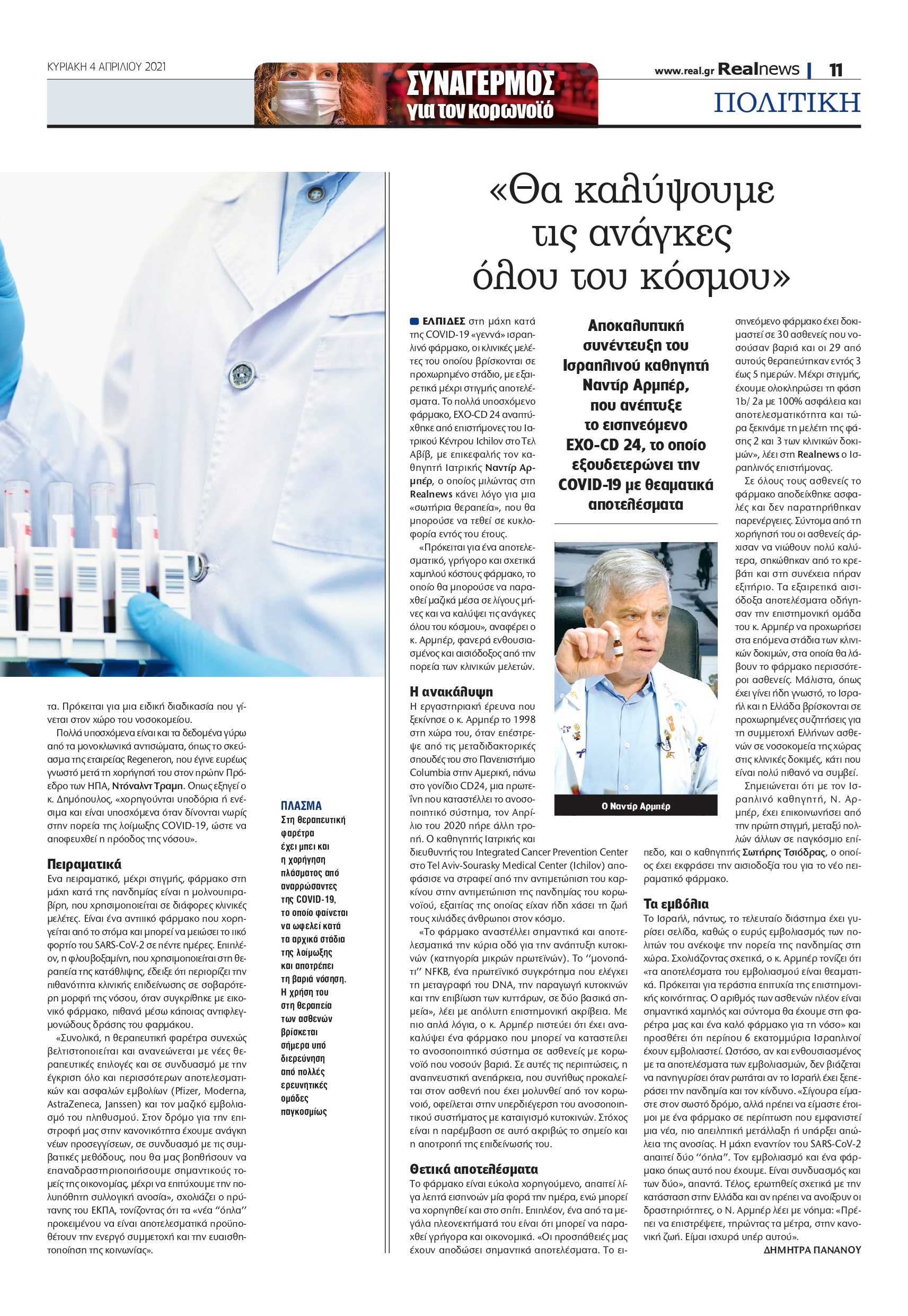 Εντείνονται οι προσπάθειες επιστημονικών ομάδων σε όλο τον κόσμο για την εύρεση θεραπείας της λοίμωξης COVID-19. Εκτός από το ισραηλινό φάρμακο EXO-CD 24, ακόμη επτά, όπως αποκαλύπτει ο καθηγητής Ιατρικής και πρύτανης του ΕΚΠΑ, Θάνος Δημόπουλος, έχουν ενταχθεί στην καθημερινή κλινική πράξη ή βρίσκονται στο στάδιο των κλινικών ερευνών με πολλά υποσχόμενα αποτελέσματα.