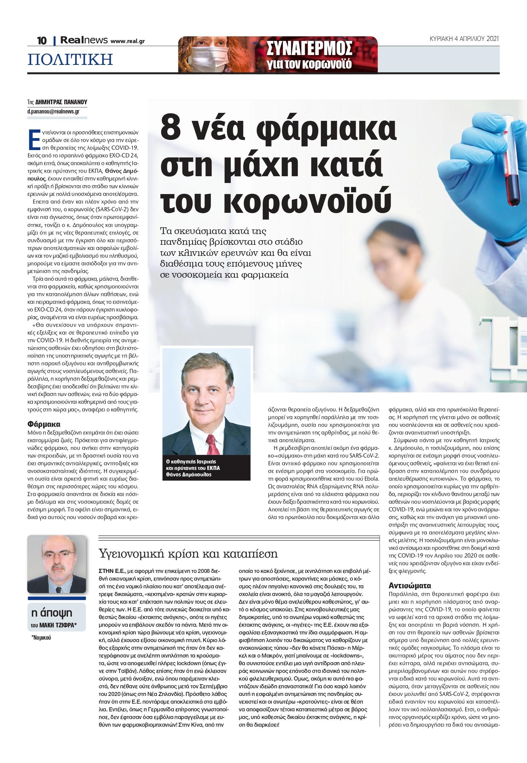 Έπειτα από έναν και πλέον χρόνο από την εμφάνισή του, ο κορωνοϊός (SARS-CoV-2) δεν είναι πια άγνωστος, όπως όταν πρωτοεμφανίστηκε, τονίζει ο κ. Δημόπουλος και υπογραμμίζει ότι με τις νέες θεραπευτικές επιλογές, σε συνδυασμό με την έγκριση όλο και περισσότερων αποτελεσματικών και ασφαλών εμβολίων και τον μαζικό εμβολιασμό του πληθυσμού, μπορούμε να είμαστε αισιόδοξοι για την αντιμετώπιση της πανδημίας. Τρία από αυτά τα φάρμακα, μάλιστα, διατίθενται στα φαρμακεία, καθώς χρησιμοποιούνται για την καταπολέμηση άλλων παθήσεων, ενώ και πειραματικά φάρμακα, όπως το εισπνεόμενο EXO-CD 24, όταν πάρουν έγκριση κυκλοφορίας, αναμένεται να είναι ευρέως προσβάσιμα. «Θα συνεχίσουν να υπάρχουν σημαντικές εξελίξεις και σε θεραπευτικό επίπεδο για την COVID-19. Η διεθνής εμπειρία της αντιμετώπισης ασθενών έχει οδηγήσει στη βελτιστοποίηση της υποστηρικτικής αγωγής με τη βέλτιστη παροχή οξυγόνου και αντιθρομβωτικής αγωγής στους νοσηλευόμενους ασθενείς. Παράλληλα, η χορήγηση δεξαμεθαζόνης και ρεμδεσιβίρης έχει αποδειχθεί ότι βελτιώνει την κλινική έκβαση των ασθενών, ενώ τα δύο φάρμακα χρησιμοποιούνται καθημερινά από τους γιατρούς στη χώρα μας», αναφέρει ο καθηγητής.