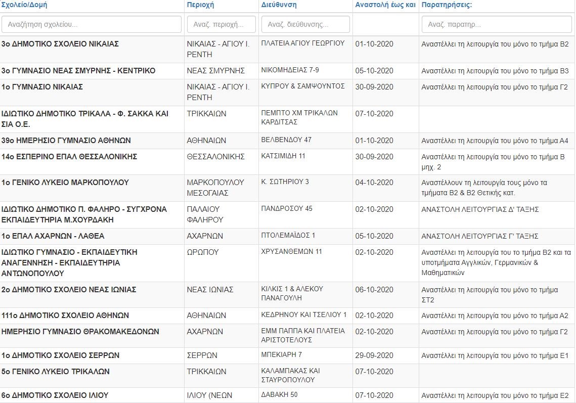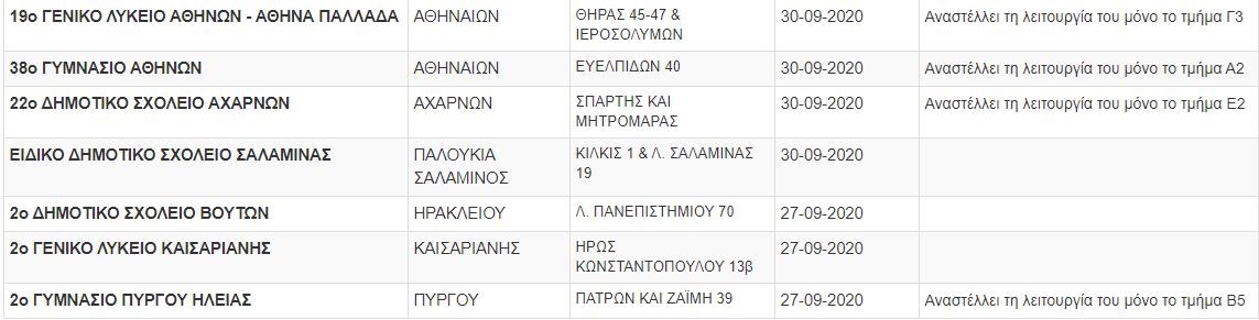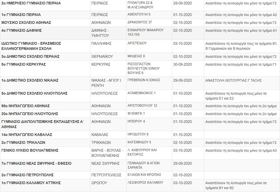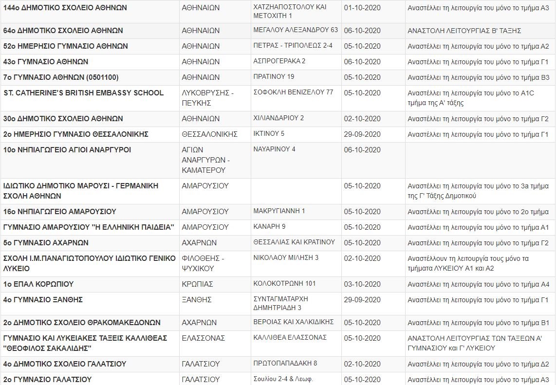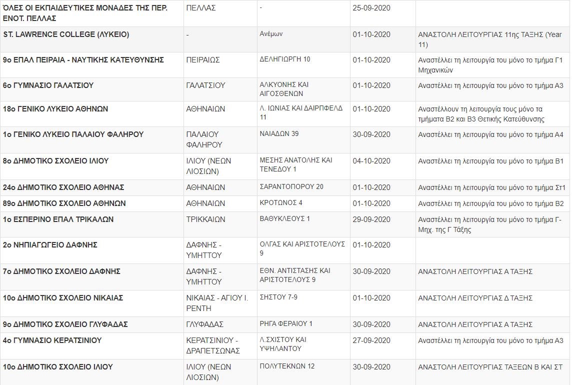 Συνολικά 94 σχολεία ή τμήματα είναι κλειστά εξαιτίας εμφάνισης κρουσμάτων κορονοϊού. Επιπλέον, σύμφωνα με την ανακοίνωση του υπουργείου Παιδείας και Θρησκευμάτων έχει ανασταλεί η λειτουργία όλων των εκπαιδευτικών μονάδων της Περιφερειακής Ενότητας Πέλλας, έως και τις 25 Σεπτεμβρίου 2020. Η λίστα με τα σχολεία ή τμήματα που είναι κλειστά ανανεώνεται συνεχώς από το υπουργείο Παιδείας.