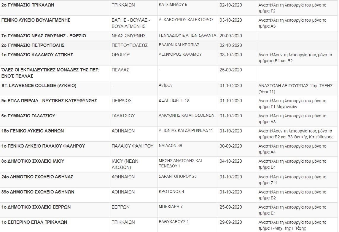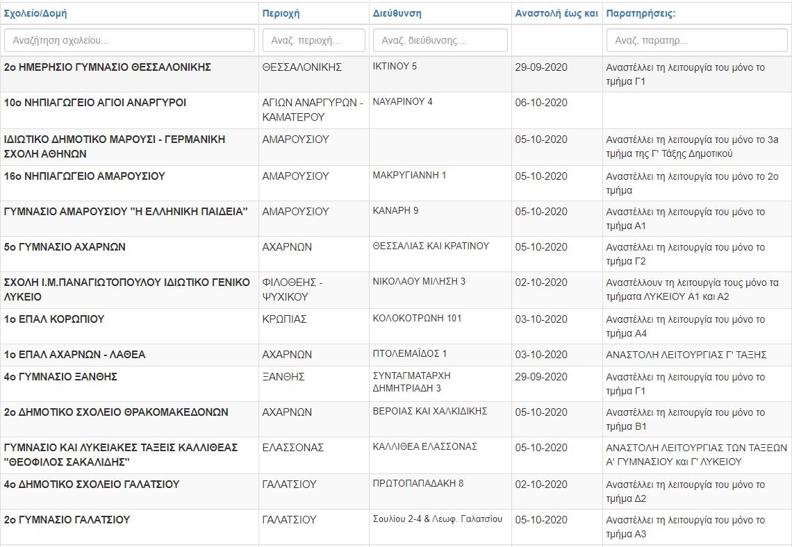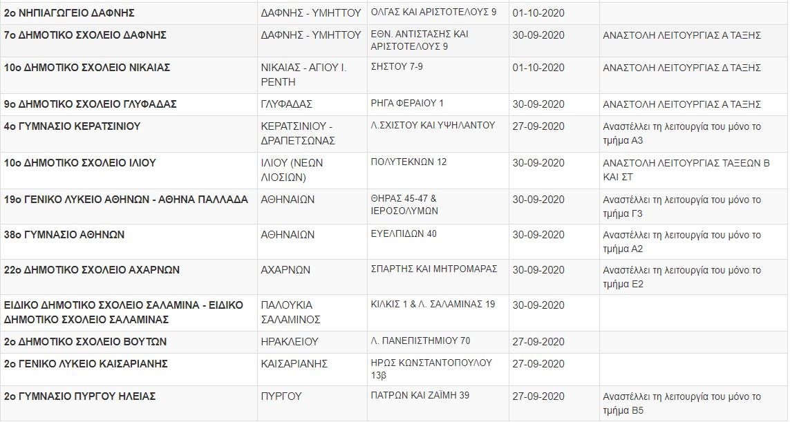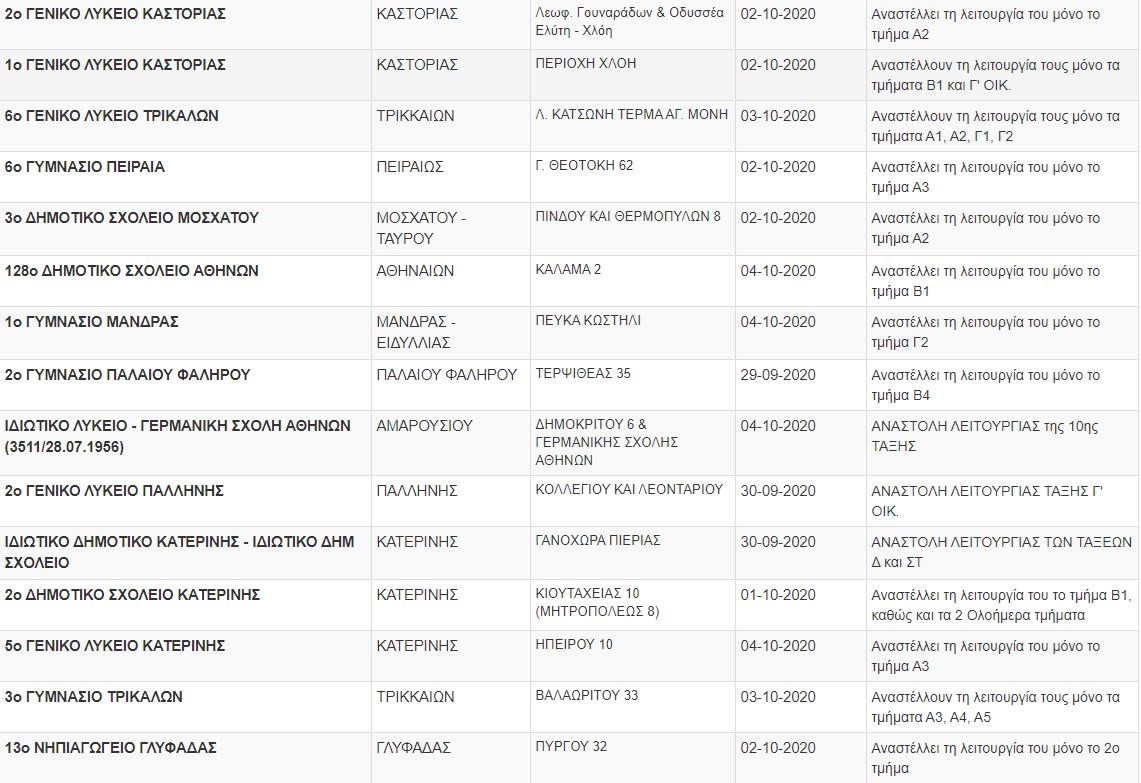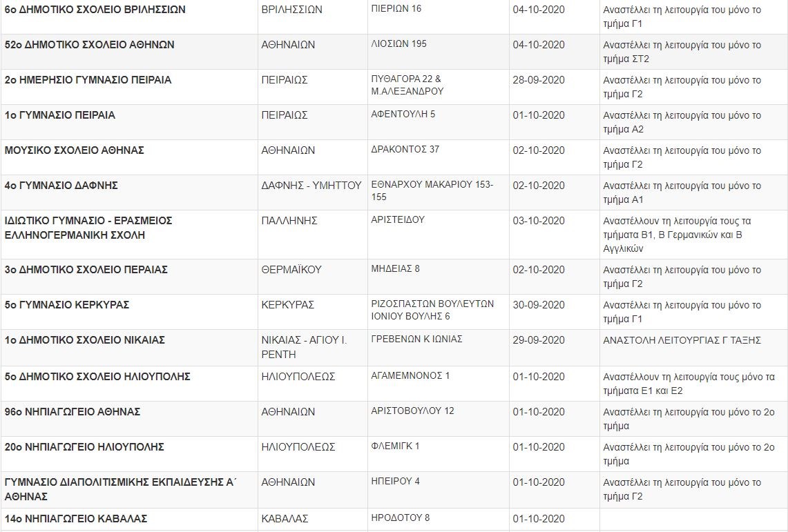 Η λίστα με τα σχολεία ή τμήματα που είναι κλειστά ανανεώνεται συνεχώς από το υπουργείο Παιδείας.