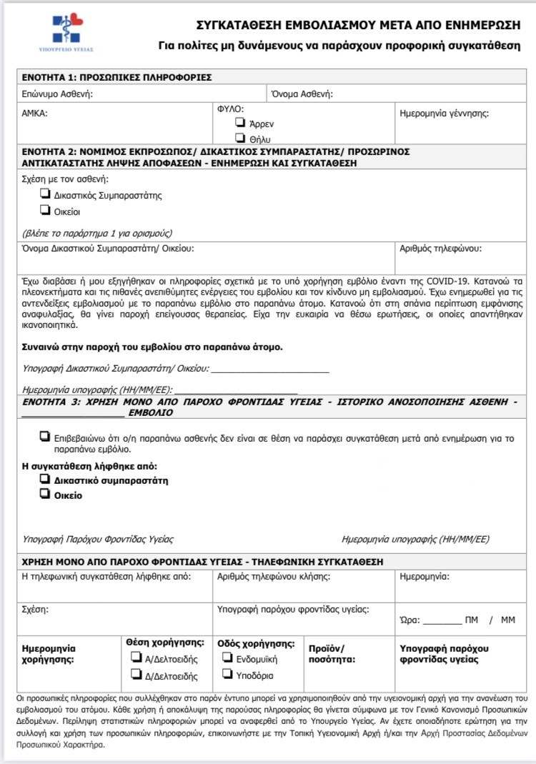 Το φως της δημοσιότητας βλέπει το έντυπο που θα υπογράφουν οι πολίτες, δίνοντας τη συγκατάθεσή τους ώστε να κάνουν το εμβόλιο κατά του κορονοϊού. Ο εμβολιασμός θα πραγματοποιείται με την προφορική ή τη γραπτή συναίνεση των πολιτών, σε όλα τα εμβολιαστικά κέντρα που θα δημιουργηθούν στην Επικράτεια.