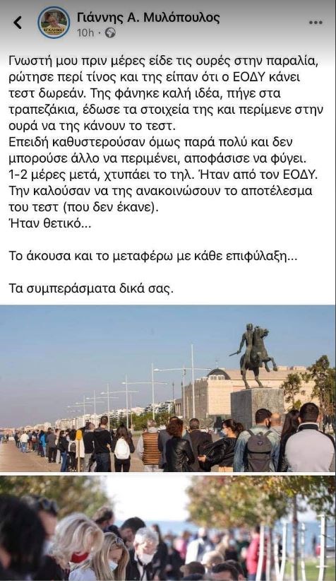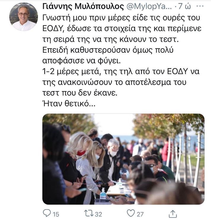 Σύμφωνα με τον κ. Μυλόπουλο, η γυναίκα περίμενε στην ουρά για να κάνει το τεστ, όμως έφυγε γιατί καθυστερούσαν και δεν μπορούσε να περιμένει άλλο. Μία με δύο ημέρες μετά, την πήραν από τον ΕΟΔΥ και της ανακοίνωσαν ότι το τεστ βγήκε θετικό, γράφει.