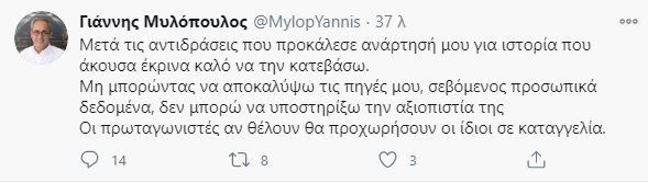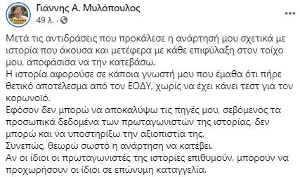 Το βράδυ της Κυριακής, ο Γιάννης Μυλόπουλος κατέβασε τις αναρτήσεις που έκανε στα social media σχετικά με την ιστορία που του μετέφερε γνωστή του, όπως έγραφε, για τα τεστ του ΕΟΔΥ.