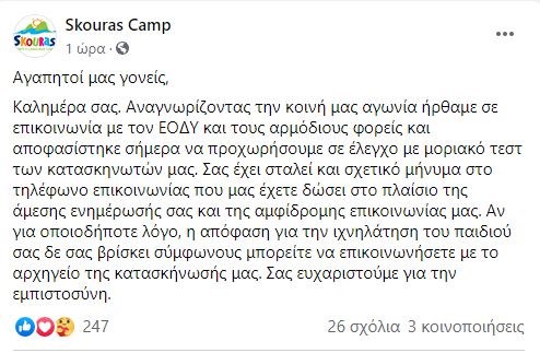 Αγωνία επικρατεί σε Χαλκιδική και Πάρο για τα κρούσματα του κορονοϊού. Στην κατασκήνωση όπου βρέθηκε θετική η 15χρονη την περασμένη εβδομάδα, βρίσκεται ήδη κλιμάκιο του ΕΟΔΥ και συζητά με τους υπεύθυνους προκειμένου να αρχίσει ο έλεγχος των περίπου 600 παιδιών που φιλοξενούνται, όπως αναφέρει σε ανακοίνωσή της η κατασκήνωση στα μέσα κοινωνικής δικτύωσης. Αναλυτικά αναφέρει ότι “αναγνωρίζοντας την κοινή αγωνία ήρθαμε σε επικοινωνία με τον ΕΟΔΥ και τους αρμόδιους φορείς και αποφασίστηκε σήμερα να προχωρήσουμε σε έλεγχο με μοριακό τεστ των κατασκηνωτών μας». Επίσης από την κατασκήνωση έχει σταλεί και σχετικό μήνυμα στο τηλέφωνο επικοινωνίας που έχουν δώσει οι γονείς των παιδιών ώστε να ενημερώνονται άμεσα και να υπάρχει αμφίδρομη επικοινωνία. Σε περίπτωση που για οποιονδήποτε λόγο οι γονείς δεν συμφωνούν για την ιχνηλάτηση του παιδιού τους καλούνται να επικοινωνήσουν με το αρχηγείο της κατασκήνωσης.