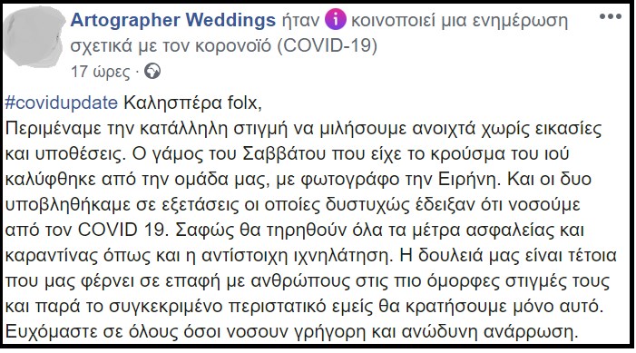 Συγκεκριμένα, τα μέλη της “Artographer Weddings” με ανάρτηση τους τονίζουν: “Καλησπέρα folx, Περιμέναμε την κατάλληλη στιγμή να μιλήσουμε ανοιχτά χωρίς εικασίες και υποθέσεις. Ο γάμος του Σαββάτου που είχε το κρούσμα του ιού καλύφθηκε από την ομάδα μας, με φωτογράφο την Ειρήνη. Και οι δυο υποβληθήκαμε σε εξετάσεις οι οποίες δυστυχώς έδειξαν ότι νοσούμε από τον COVID 19. Σαφώς θα τηρηθούν όλα τα μέτρα ασφαλείας και καραντίνας όπως και η αντίστοιχη ιχνηλάτηση. Η δουλειά μας είναι τέτοια που μας φέρνει σε επαφή με ανθρώπους στις πιο όμορφες στιγμές τους και παρά το συγκεκριμένο περιστατικό εμείς θα κρατήσουμε μόνο αυτό. Ευχόμαστε σε όλους όσοι νοσούν γρήγορη και ανώδυνη ανάρρωση”.
