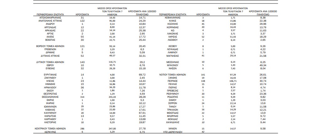 Αναλυτικά τα τα κρούσματα στις περιφερειακές ενότητες που ανήκουν στην Αττική: