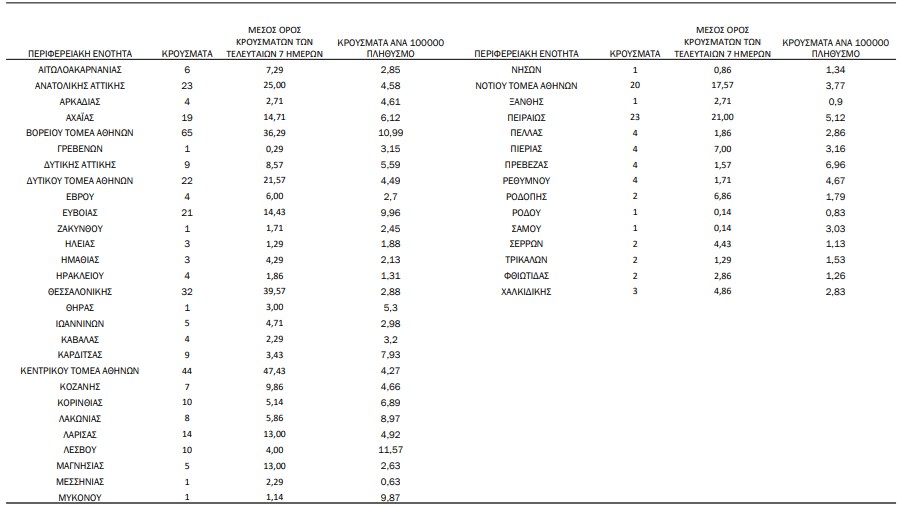 Σύμφωνα με την ενημέρωση της Δευτέρας από τον ΕΟΔΥ, 65 από τα 207 κρούσματα στην Αττική διαγνώστηκαν στον Βόρειο Τομέα Αθηνών. Εξαιρετικά ψηλά παραμένουν τα νούμερα και στον Κεντρικό Τομέα με 44, ενώ στην Ανατολική Αττική υπήρξαν 23 νέες διαγνώσεις. Στη Δυτική Αττική 9 και στον Δυτικό Τομέα Αθηνών 22, 20 κρούσματα κατεγράφησαν στον Νότιο Τομέα και 1 στις Νήσους, ενώ στον Πειραιά εντοπίστηκαν 23 νέα κρούσματα.