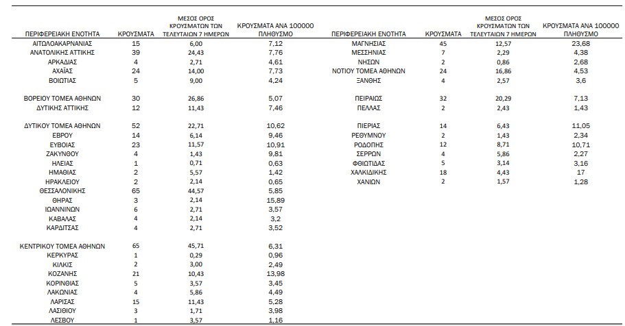Από τα 256 νέα κρούσματα, τα 65 εντοπίστηκαν στον Κεντρικό Τομέα Αθηνών, ενώ πολύ υψηλά ήταν τα νούμερα στον Δυτικό Τομέα Αθηνών με 52, αλλά και στη Δυτική Αττική με 12. Στην Ανατολική Αττική υπήρξαν 39 νέες διαγνώσεις, ενώ στον Βόρειο Τομέα 30. Στον Νότιο Τομέα Αθηνών εντοπίστηκαν 24 νέα κρούσματα, στις Νήσους 2, ενώ στον Πειραιά 32.