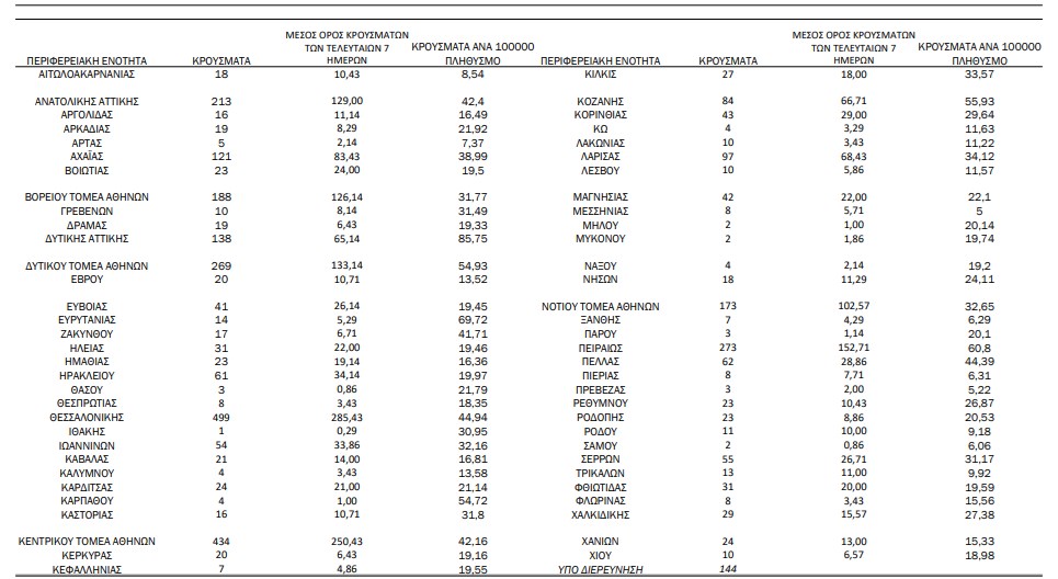 Το κέντρο της πρωτεύουσας έδωσε εκ νέου τις περισσότερες μολύνσεις, και συγκεκριμένα 433, ενώ ακολουθούν τα δυτικά προάστια με 269 και η Δυτική Αττική με 138. Υψηλά παραμένουν τα νούμερα και στον Πειραιά με 273 νέα κρούσματα, ενώ μεγάλη αύξηση παρουσιάζει και η Ανατολική Αττική με 213. Στα νησιά καταγράφηκαν 18, ενώ στα νότια προάστια 173 κρούσματα.