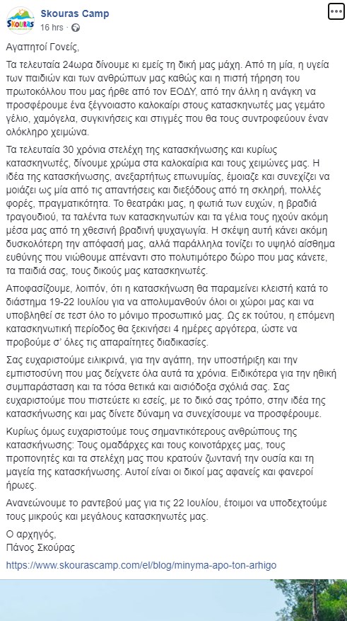 “Τα τελευταία 24ωρα δίνουμε κι εμείς τη δική μας μάχη. Από τη μία, η υγεία των παιδιών και των ανθρώπων μας καθώς και η πιστή τήρηση του πρωτοκόλλου που μας ήρθε από τον ΕΟΔΥ, από την άλλη η ανάγκη να προσφέρουμε ένα ξέγνοιαστο καλοκαίρι στους κατασκηνωτές μας γεμάτο γέλιο, χαμόγελα, συγκινήσεις και στιγμές που θα τους συντροφεύουν έναν ολόκληρο χειμώνα.Τα τελευταία 30 χρόνια στελέχη της κατασκήνωσης και κυρίως κατασκηνωτές, δίνουμε χρώμα στα καλοκαίρια και τους χειμώνες μας. Η ιδέα της κατασκήνωσης, ανεξαρτήτως επωνυμίας, έμοιαζε και συνεχίζει να μοιάζει ως μία από τις απαντήσεις και διεξόδους από τη σκληρή, πολλές φορές, πραγματικότητα. Το θεατράκι μας, η φωτιά των ευχών, η βραδιά τραγουδιού, τα ταλέντα των κατασκηνωτών και τα γέλια τους ηχούν ακόμη μέσα μας από τη χθεσινή βραδινή ψυχαγωγία. Η σκέψη αυτή κάνει ακόμη δυσκολότερη την απόφασή μας, αλλά παράλληλα τονίζει το υψηλό αίσθημα ευθύνης που νιώθουμε απέναντι στο πολυτιμότερο δώρο που μας κάνετε, τα παιδιά σας, τους δικούς μας κατασκηνωτές.