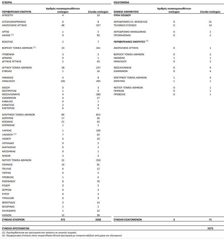 Τα νέα εργαστηριακά επιβεβαιωμένα κρούσματα της νόσου που καταγράφηκαν τις τελευταίες 24 ώρες είναι 3.491, εκ των οποίων 10 εντοπίστηκαν κατόπιν ελέγχων στις πύλες εισόδου της χώρας. Ο συνολικός αριθμός των κρουσμάτων ανέρχεται σε 267.172 (ημερήσια μεταβολή +1.3%), εκ των οποίων 51.5% άνδρες. Με βάση τα επιβεβαιωμένα κρούσματα των τελευταίων 7 ημερών, 98 θεωρούνται σχετιζόμενα με ταξίδι από το εξωτερικό και 2.927 είναι σχετιζόμενα με ήδη γνωστό κρούσμα.