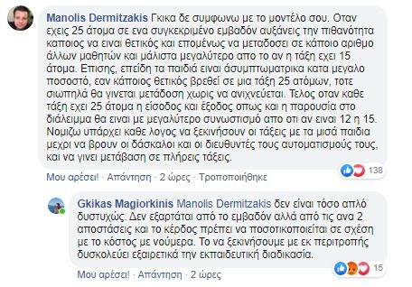 “Νομίζω ότι το κόστος αν έχουμε εξάρσεις θα είναι πολύ μεγάλο. Φυσικά έχει σχέση το εμβαδόν γιατί οσο μεγαλύτερο το εμβαδόν με τον ίδιο αριθμό ατόμων τόσο μικρότερος ο συνωστισμός. Το εμβαδόν και η πυκνότητα του κόσμου ήταν πάντα σημαντικός ο παράγοντας σε όλα (εστιατόρια, χώροι εργασία κτλ), γιατί ξαφνικά δεν είναι σχετικό στα σχολεία;” έγραψε στη συνέχεια ο κ. Δερμιτζάκης.