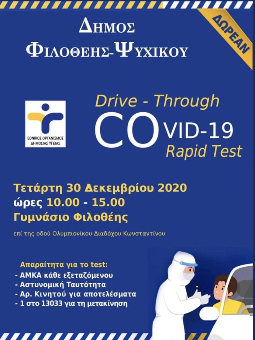 Ο Δήμος Φιλοθέης-Ψυχικού σε συνεργασία με τις Κινητές Ομάδες Υγείας (ΚΟΜΥ) του Εθνικού Οργανισμού Υγείας ΕΟΔΥ, στα πλαίσια ελέγχου για την αποφυγή και διάδοση του κορονοϊού Covid-19, θα πραγματοποιήσει δωρεάν έλεγχο με τη μέθοδο “Ταχείας ανίχνευσης αντιγόνου”, “Rapid Test”, μέσα από το αυτοκίνητο (drive through), την Τετάρτη 30 Δεκεμβρίου 2020 από τις 10.00 έως τις 15.00, έξω από το Γυμνάσιο Φιλοθέης επί της οδού Ολυμπιονίκου Διαδόχου Κωνσταντίνου.