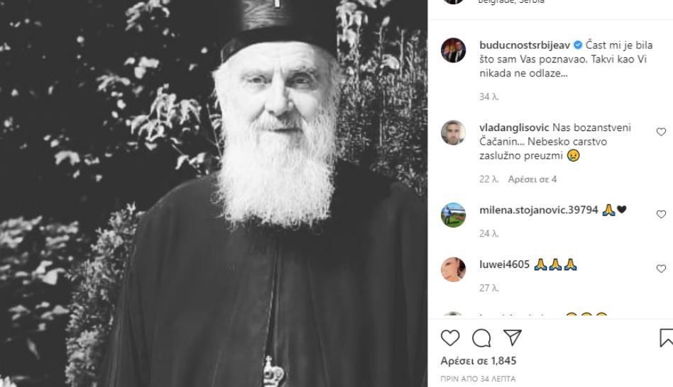Εκοιμήθη ο Πατριάρχης Σερβίας, Ειρηναίος ο οποίος νοσηλευόταν με κορονοϊό. Ο Ειρηναίος νοσηλευόταν σε νοσοκομείο του Βελιγραδίου και τις τελευταίες ώρες είχε γίνει γνωστό ότι η κατάσταση της υγείας του είχε επιδεινωθεί. Τον θάνατό του ανακοίνωσε ο Πρόεδρος της Σερβίας, Αλεξάνταρ Βούτσις. Σε ανάρτησή του στον προσωπικό λογαριασμό του στο Instagram, ανέβασε μια ασπρόμαυρη φωτογραφία του Πατριάρχη Ειρηναίου και έγραψε χαρακτηριστικά: “Ήταν τιμή μου που σε γνώρισα. Άνθρωποι σαν εσένα δεν φεύγουν ποτέ…”.