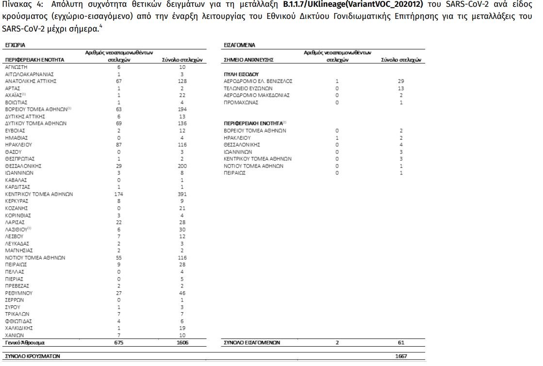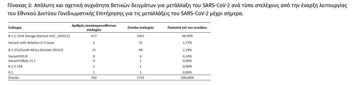 Ολοκληρώθηκε η γονιδιωματική ανάλυση σε 944 επιλεγμένα νέα δείγματα που αφορούν στην περίοδο 22 Ιανουαρίου έως 1 Μαρτίου 2021. Τα δείγματα προέρχονται από τις Περιφέρειες Κεντρικής Μακεδονίας, Ηπείρου, Ιονίων Νήσων, Θεσσαλίας, Κρήτης, Αττικής και τις Περιφερειακές Ενότητες Φθιώτιδας, Βοιωτίας, Εύβοιας, Κορινθίας, Αιτωλοακαρνανίας, Αχαΐας, Μυτιλήνης και Σύρου. Από τον έλεγχο των 944 δειγμάτων, αναδείχθηκαν συνολικά 702 στελέχη με μεταλλάξεις ειδικού ενδιαφέροντος (variants of concern). Από τα 702 στελέχη, τα 677 βρέθηκαν με τη μετάλλαξη Β.1.1.7/UK lineage (Variant VOC_202012) και 21 στελέχη βρέθηκαν με τη μετάλλαξη Lineage B.1.351/South Africa (Variant 501V2) (Πίνακας 3). Συνολικά έχουν ταυτοποιηθεί 1.667 θετικά για την παρουσία μετάλλαξης Β.1.1.7/UK lineage (Variant VOC_202012) (Πίνακας 4) και 48 θετικά για την παρουσία μετάλλαξης B.1.351/South Africa (Variant 501V2) από την έναρξη λειτουργίας του Εθνικού Δικτύου Γονιδιωματικής Επιτήρησης για τις μεταλλάξεις του SARS- CoV-2 έως σήμερα. Τα 48 θετικά για την παρουσία μετάλλαξης Lineage B.1.351/South Africa (Variant 501V2) είναι όλα εγχώρια, εκ των οποίων 41 προέρχονται από την Περιφερειακή Ενότητα Θεσσαλονίκης, 2 από την Περιφερειακή Ενότητα Ιωαννίνων και 5 από την Περιφέρεια Αττικής.