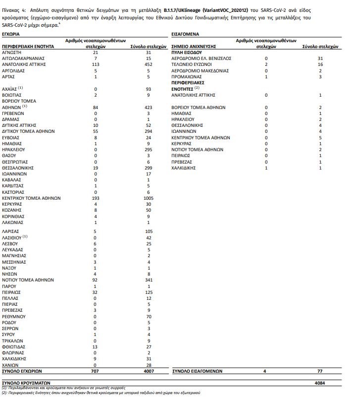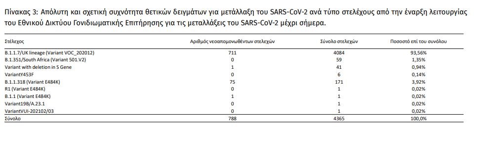 Ολοκληρώθηκε η γονιδιωματική ανάλυση σε 897 επιλεγμένα δείγματα που αφορούν στην περίοδο 4 Ιανουαρίου έως 25 Μαρτίου 2021. Τα δείγματα προέρχονται από τις Περιφέρειες Δυτικής Μακεδονίας, Κεντρικής Μακεδονίας, Δυτικής Ελλάδας, Πελοποννήσου, Αττικής, Κρήτης, Ηπείρου, Θεσσαλίας, Ιονίων Νήσων, Νότιου Αιγαίου, Βόρειου Αιγαίου και Στερεάς Ελλάδας. Από τον έλεγχο των 897 δειγμάτων, αναδείχθηκαν συνολικά 711 δείγματα με στελέχη μεταλλάξεων ειδικού ενδιαφέροντος (Variants Of Concern – VOC), 76 δείγματα με στελέχη υπό διερεύνηση (Variants Under Investigation – VUI) και ένα δείγμα θετικό για Variant with deletion in S Gene. Τα 711 δείγματα με στελέχη μεταλλάξεων ειδικού ενδιαφέροντος αφορούσαν τη μετάλλαξη Β.1.1.7/UK lineage (Variant VOC_202012) ενώ από τα 76 δείγματα με στελέχη VUI, τα 75 αφορούσαν το στέλεχος B.1.1.318 (Variant_E484K) και 1 αφορούσε το στέλεχος Β.1.1 (Variant_Ε484Κ) (Πίνακας 3). Επιπλέον, ολοκληρώθηκε η γονιδιωματική ανάλυση σε 11 επιλεγμένα δείγματα που αφορούν στην περίοδο 9 Οκτωβρίου έως 28 Δεκεμβρίου του 2020. Τα δείγματα προέρχονται από την Περιφέρεια Αττικής. Από τον έλεγχο των δειγμάτων αυτών δεν αναδείχθηκε κανένα δείγμα με στελέχη μεταλλάξεων ειδικού ενδιαφέροντος (V0C) ή με στελέχη μεταλλάξεων υπό διερεύνηση (VUI). Συνολικά έχουν ταυτοποιηθεί 4084 θετικά για την παρουσία μετάλλαξης Β.1.1.7/UK lineage (Variant VOC_202012) (Πίνακας 4) και 59 θετικά για την παρουσία μετάλλαξης B.1.351/South Africa (Variant 501.V2) από την έναρξη λειτουργίας του Εθνικού Δικτύου Γονιδιωματικής Επιτήρησης για τις μεταλλάξεις του SARS-CoV-2 έως σήμερα. Από τα 59 θετικά στελέχη για την παρουσία μετάλλαξης Lineage B.1.351/South Africa (Variant 501.V2) τα 57 είναι εγχώρια, εκ των οποίων 47 προέρχονται από την Περιφερειακή Ενότητα Θεσσαλονίκης, 2 από την Περιφερειακή Ενότητα Ιωαννίνων, 5 από την Περιφέρεια Αττικής, 1 από την Περιφερειακή Ενότητα Αιτωλοακαρνανίας, 1 από την Περιφερειακή Ενότητα Ηρακλείου και 1 από την Περιφερειακή Ενότητα Χανίων. Πίνακας 3: Απόλυτη και σχετική συχνότητα θετικών δειγμάτων για μετάλλαξη του SARS-CoV-2 ανά τύπο στελέχους από την έναρξη λειτουργίας του Εθνικού Δικτύου Γονιδιωματικής Επιτήρησης για τις μεταλλάξεις του SARS-CoV-2 μέχρι σήμερα.