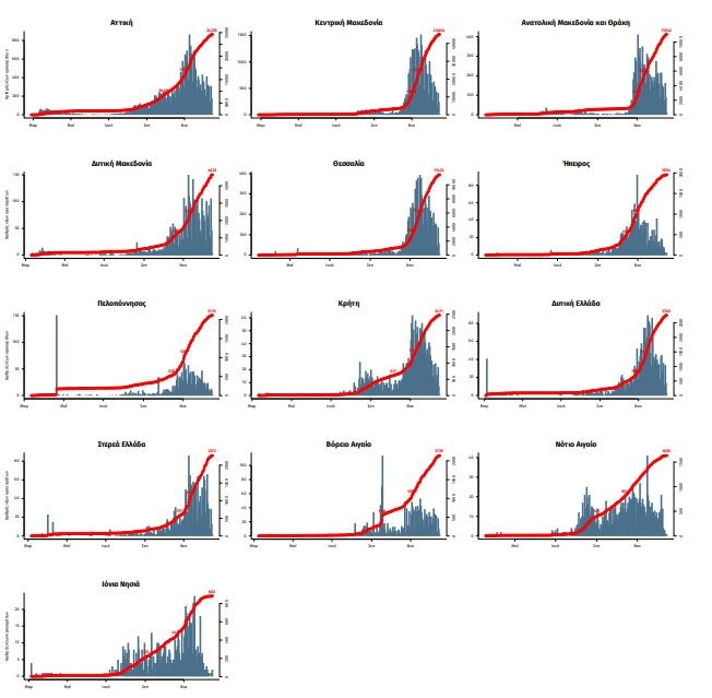 Παράρτημα 1: Επιδημικές καμπύλες κρουσμάτων COVID-19 με βάση την δηλωθείσα διεύθυνση μόνιμης κατοικίας του κρούσματος ή τη διεύθυνση προσωρινής διαμονής για τους τουρίστες και άλλους προσωρινά διαμένοντες στην Ελλάδα. Συμπεριλαμβάνονται τόσο κρούσματα με ιστορικό ταξιδίου όσο και κρούσματα με πιθανή εγχώρια μετάδοση.
