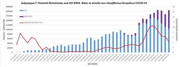 Όπως ανακοίνωσε ο ΕΟΔΥ, την εβδομάδα 7 – 13 Δεκεμβρίου (Iso Week 50) το ποσοστό θετικότητας ήταν 4.34% σε σύνολο 104.172 RT-PCR και 80.466 Rapid Ag τεστ που πραγματοποιήθηκαν.