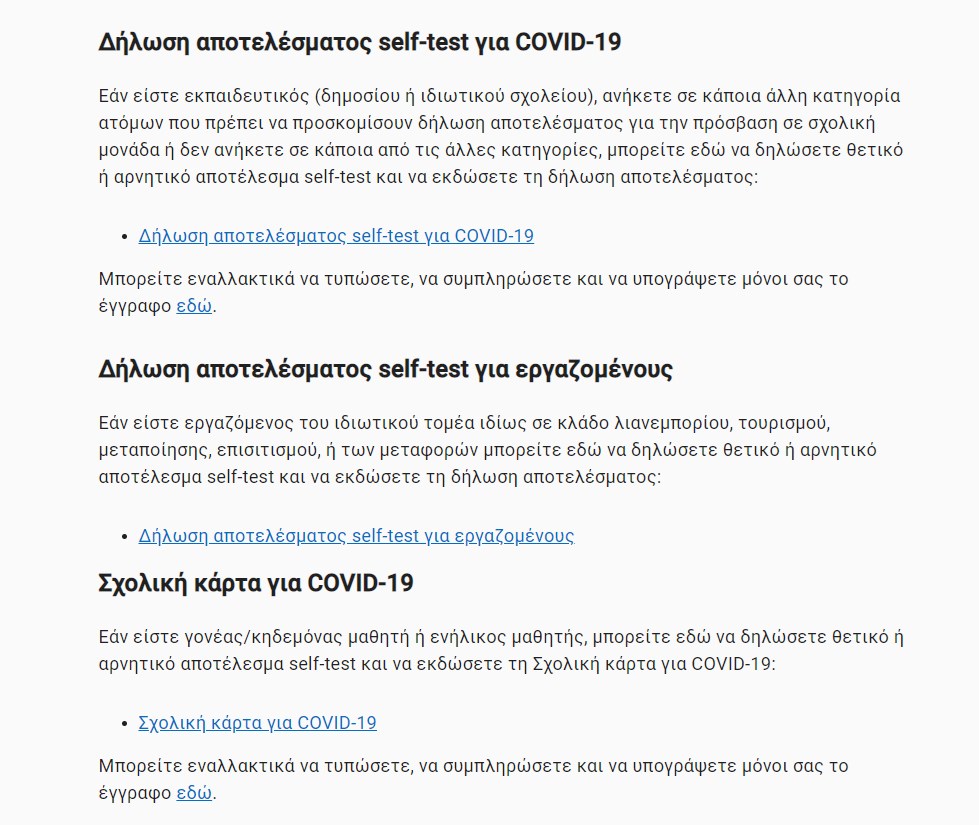 1. Δήλωση αποτελέσματος self–test για COVID-19: Δήλωση αποτελέσματος για το γενικό πληθυσμό και εκπαιδευτικούς, μέλη ΕΕΠ/ΕΒΠ, διοικητικό και λοιπό προσωπικό των σχολείων.