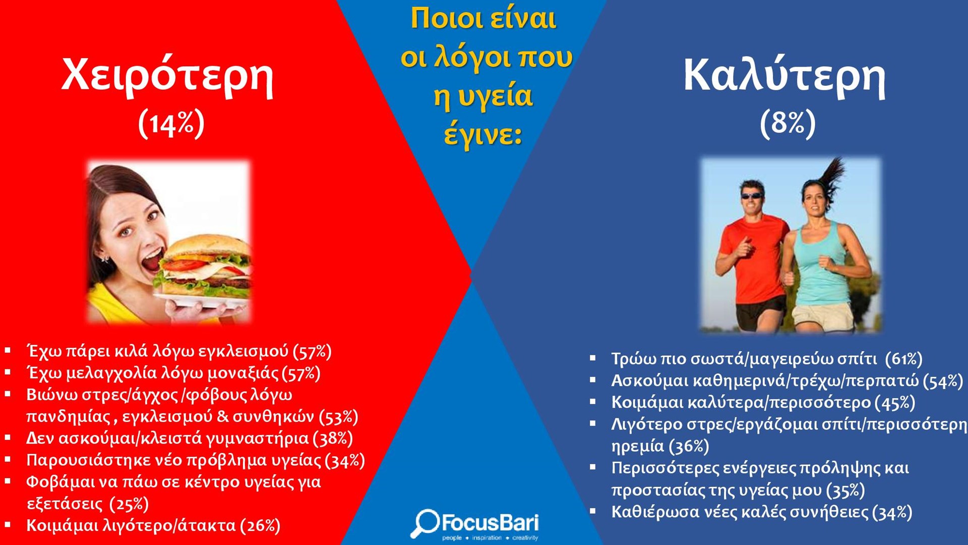 -Για εκείνους που η υγεία είναι σήμερα καλύτερη, οι λόγοι είναι το ότι τρέφονται πιο σωστά/μαγειρεύουν στο σπίτι, ασκούνται καθημερινά, κοιμούνται καλύτερα, νιώθουν λιγότερο στρες και αφιερώνουν περισσότερο χρόνο στον εαυτό τους και στην πρόληψη της υγείας τους, ενώ κάποιοι έχουν υιοθετήσει κάποιες νέες, καλές, καθημερινές συνήθειες.