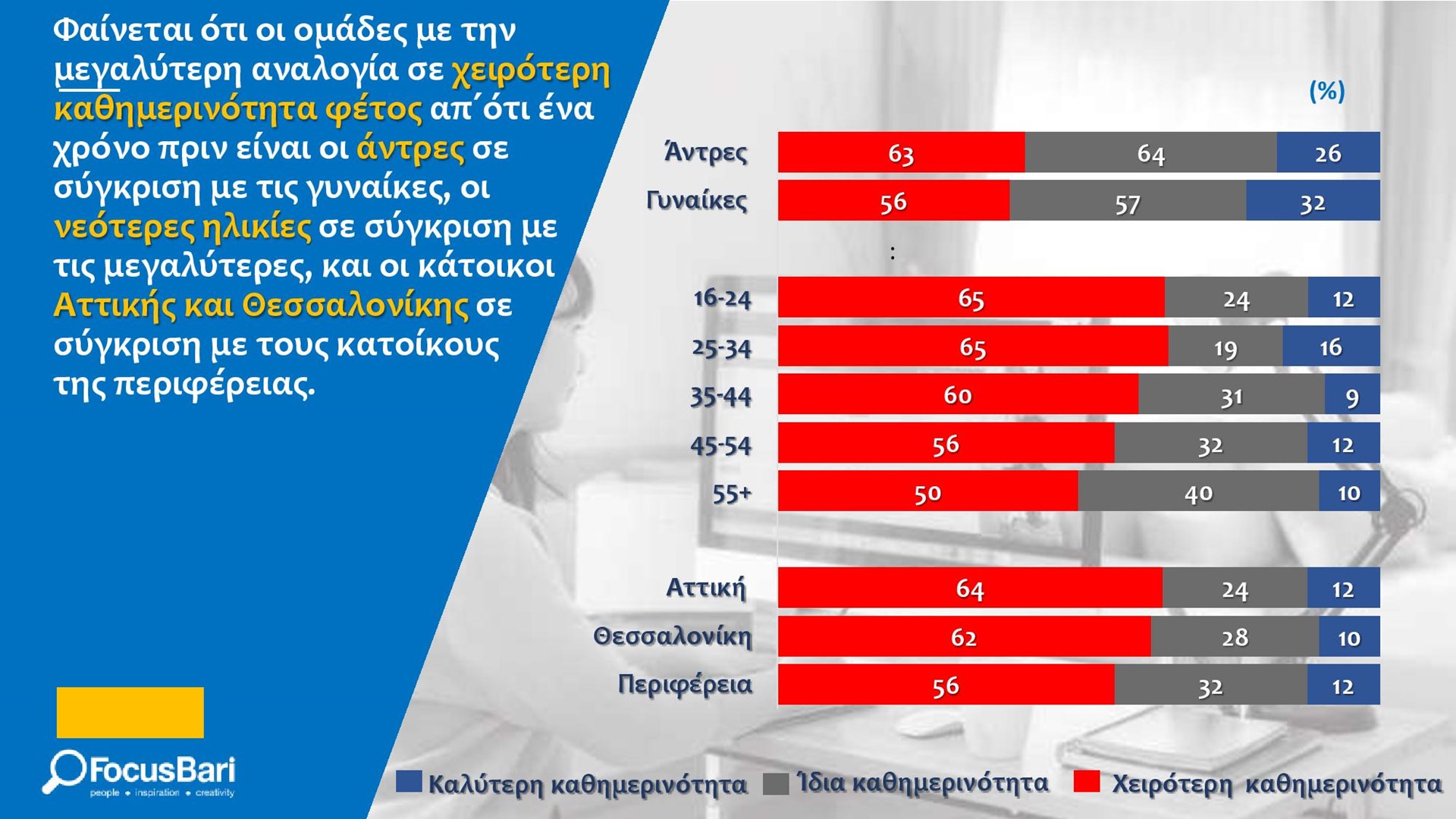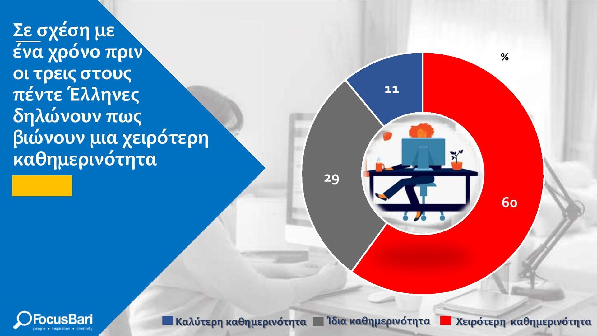 -Τρεις στους πέντε Έλληνες (60%) δηλώνουν πώς η καθημερινότητά τους είναι χειρότερη σήμερα σε σχέση με ένα χρόνο πριν, ενώ λιγότεροι από ένας στους τρεις (29%) θεωρούν ότι δεν έχει αλλάξει, αλλά και ένας στους δέκα (11%) ζει σήμερα μια καλύτερη καθημερινότητα απ΄ ότι πριν την πανδημία.