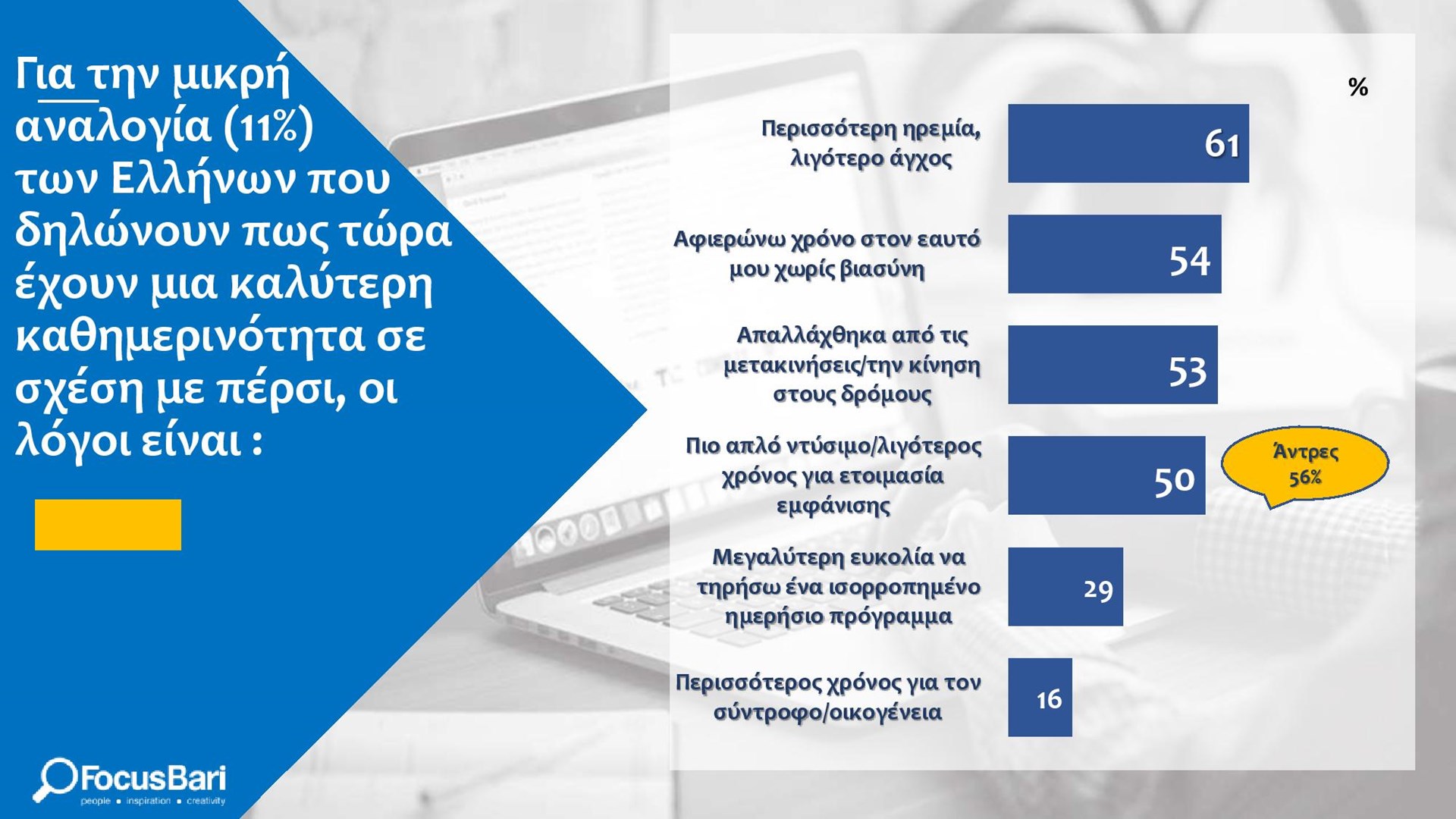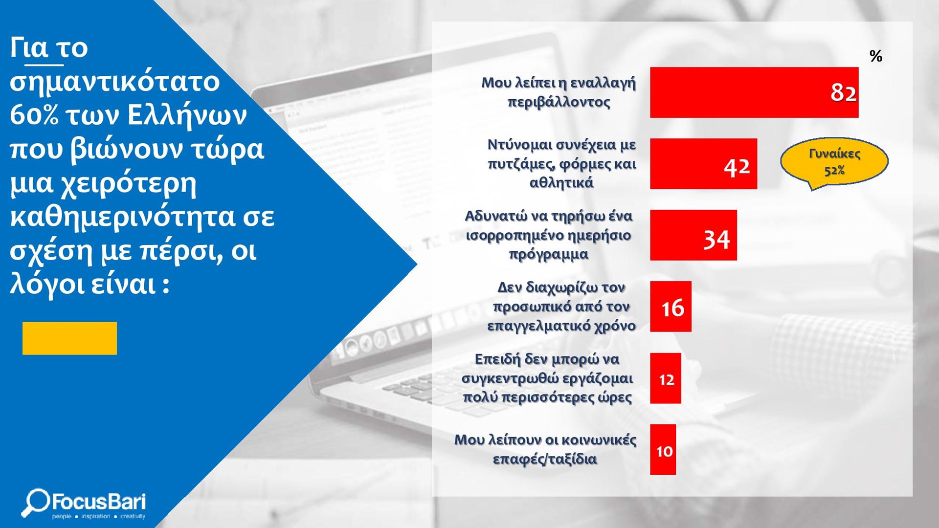 -Για εκείνους που η καθημερινότητα έχει γίνει χειρότερη, οι λόγοι είναι η έλλειψη αλλαγής περιβάλλοντος (82%), το ότι ντύνονται συνέχεια με πυτζάμες, φόρμες και αθλητικά (42% και 52% μεταξύ γυναικών), καθώς και το ότι δυσκολεύονται να τηρήσουν ένα ισορροπημένο ημερήσιο πρόγραμμα (37%).