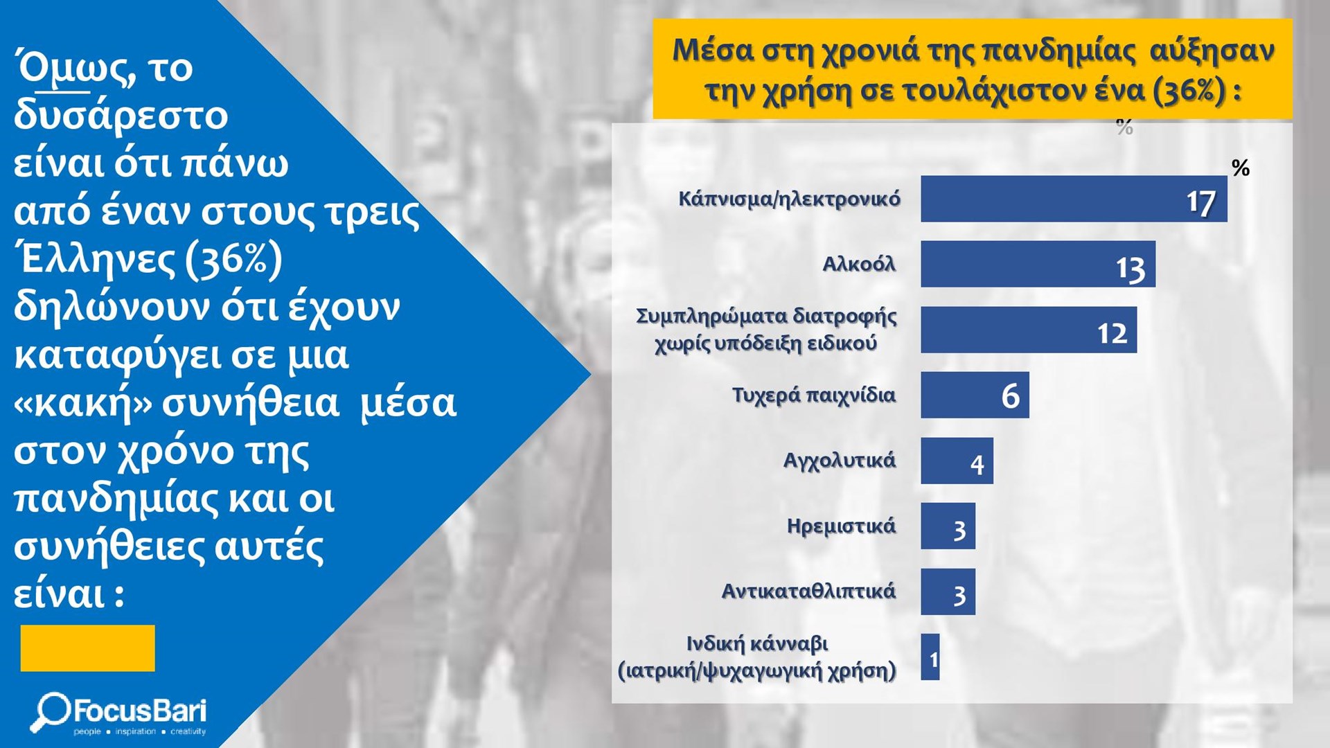 -Τέλος, η χειρότερη καθημερινότητα, και οι συνθήκες της πανδημίας, έχουν οδηγήσει πάνω από έναν στους τρεις Έλληνες (36%) να ξεκινήσει ή/και να αυξήσει τουλάχιστον μία από μια σειρά βλαβερών συνηθειών όπως το κάπνισμα/άτμισμα, η κατανάλωση αλκοόλ, τα στοιχήματα, η υπερβολή σε συμπληρώματα διατροφής χωρίς οδηγίες ειδικού, κλπ.