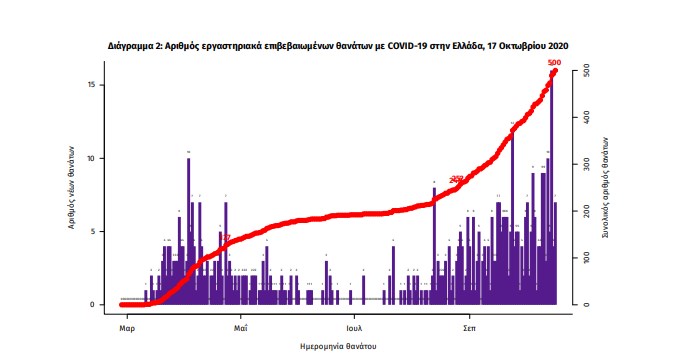 Ο φονικός κορονοϊός συνεχίζει την επέλασή του. Ο Οκτώβριος αποδεικνύεται “μαύρος” μήνας και αυτό καθώς μέσα στις πρώτες 17 ημέρες έχουν χάσει τη ζωή τους 109 άνθρωποι. Σύμφωνα με την έκθεση του ΕΟΔΥ που δημοσιεύθηκε το Σάββατο 17 Οκτωβρίου οι νεκροί πλέον ανέρχονται σε 500. Εκατόν ογδόντα οκτώ (37,6%) γυναίκες και οι υπόλοιποι άνδρες. Η διάμεση ηλικία των θανόντων ήταν τα 79 έτη και το 96,2% είχε κάποιο υποκείμενο νόσημα ή/και ηλικία 70 ετών και άνω. Μόνο χθες κατέληξαν 10 συνάνθρωποί μας, ενώ μέσα σε 17 ημέρες έχουν χάσει τη μάχη με τη ζωή 109 άτομα.