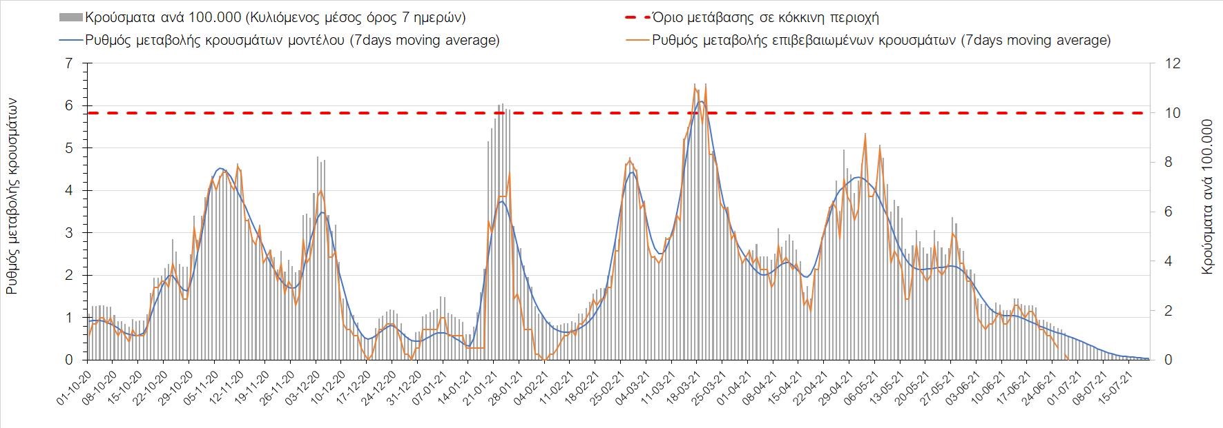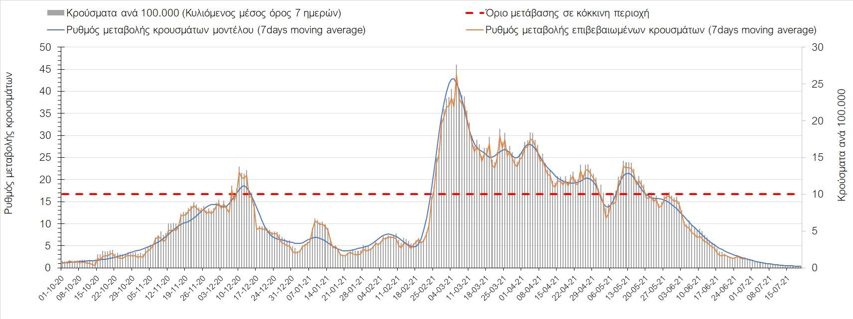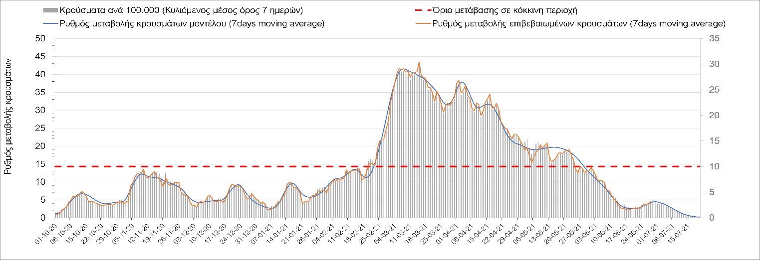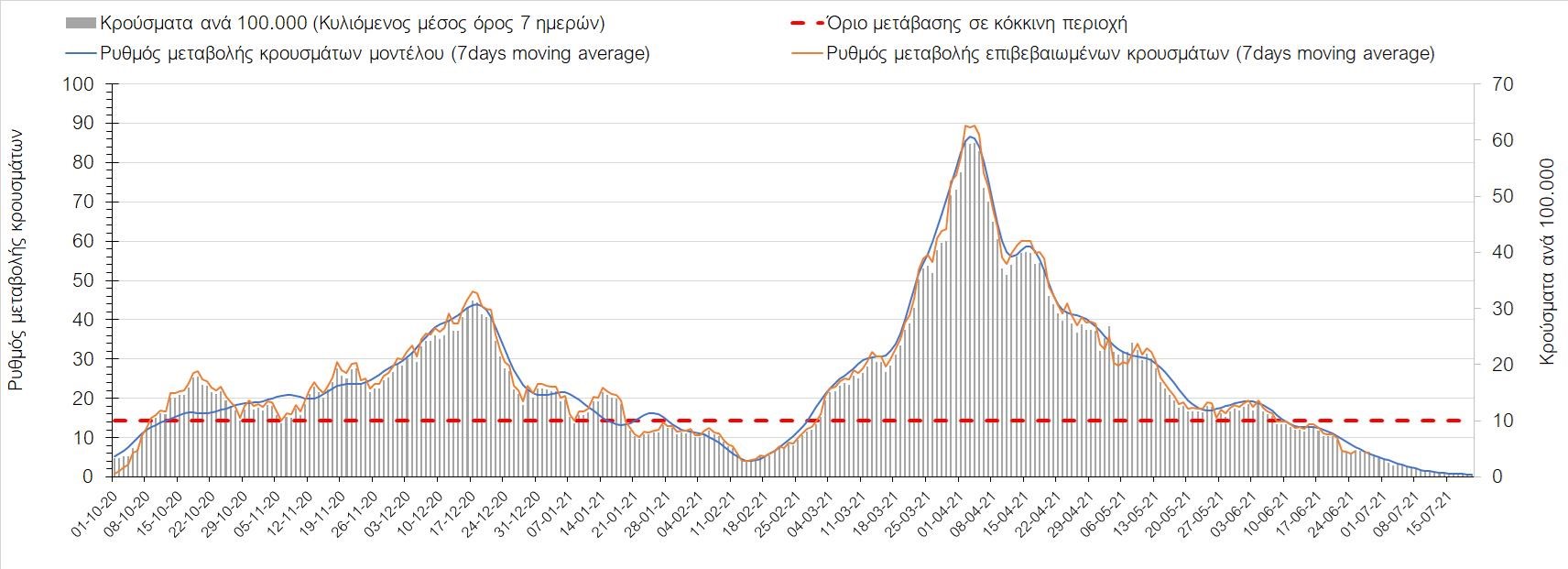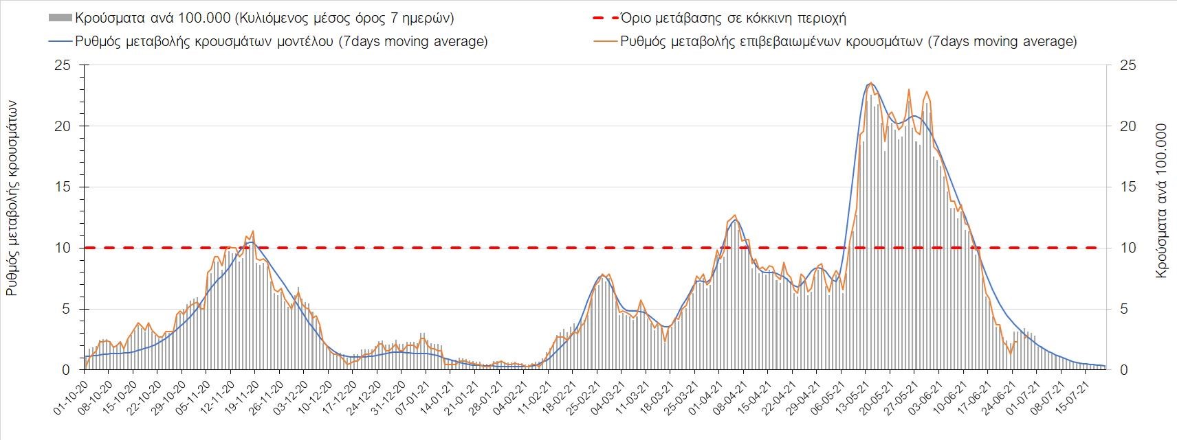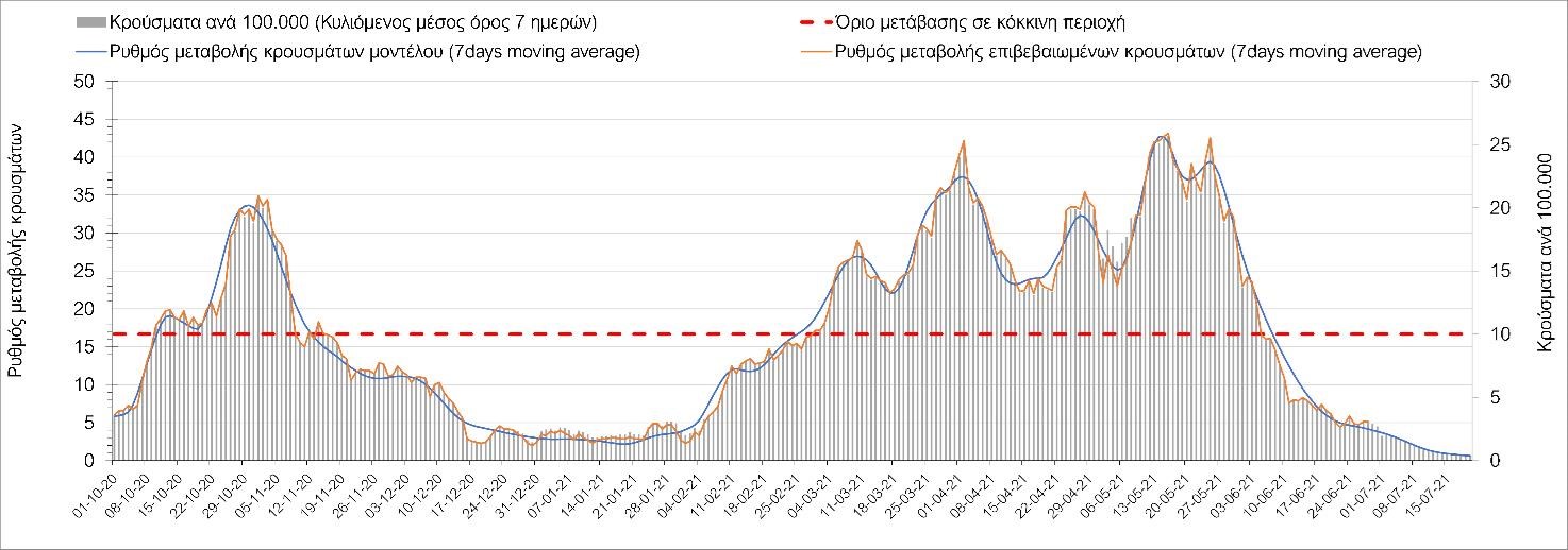 Όσον αφορά επιμέρους περιοχές, όλες πλέον βρίσκονται σε πτωτική πορεία, ενώ με τα τωρινά δεδομένα και λαμβάνοντας υπόψη την αναμενόμενη πορεία, πλέον δεν υφίσταται ανάγκη επιτήρησης για καμία περιφέρεια, με μικρή επιφύλαξη μόνο για το Ρέθυμνο, όπου έχει παρουσιαστεί μια έντονη διακύμανση τις προηγούμενες ημέρες, παρόλο που αναμένουμε να επανέλθει σε πτωτική πορεία. Επίσης, όπως αναφέρθηκε, προβληματίζει η σταθεροποίηση στην Αθήνα, και ο βαθμός που αυτή σχετίζεται με την εξάπλωση μεταλλαγμένων και ταχύτερα μεταδιδόμενων στελεχών (κυρίως το Β.1.1.318 αλλά και το Β.1.617).Με βάση τον υψηλό αριθμό των self-test που πραγματοποιείται τις τελευταίες εβδομάδες, πλέον δεν αναμένουμε αναστροφή της πορείας αποκλιμάκωσης, αρκεί να συνεχιστεί η συμμόρφωση με τα ισχύοντα μέτρα περιορισμού της πανδημίας (χρήση μάσκας και περιορισμοί που αφορούν κυρίως κλειστούς χώρους) και κυρίως η συνέχιση των self-test σε όσο το δυνατόν μεγαλύτερο τμήμα του πληθυσμού (με έμφαση στους εργαζόμενους σε δραστηριότητες με μεγάλο αριθμό ενεργών επαφών). Επίσης, σύμφωνα με τα πιο πρόσφατα στοιχεία που έγιναν διαθέσιμα, ανησυχία πλέον δημιουργεί η αύξηση του ποσοστού διασποράς του μεταλλαγμένου στελέχους Β.1.1.318 σε συγκεκριμένες περιοχές για το 15νθήμερο από 10/05/2021 έως 23/05/2021, όπου οι αντίστοιχες ποσοστώσεις είναι 17.57% για την Αττική, 52.11% για τη Στερεά Ελλάδα, 40% για την Ήπειρο και 19.28% για την Πελοπόννησο, αλλά και η εμφάνιση πλέον στη χώρα της μετάλλαξης Β.1.617. Με δεδομένα τα υπάρχοντα ανοίγματα και την έλευση των τουριστικών ροών είναι ακόμα πιο σημαντική η τήρηση των μέτρων, με κυριότερη την ορθή και μαζική εφαρμογή των self-test, με ταυτόχρονη αύξηση της ιχνηλασίας των επαφών των ανιχνευθέντων ως θετικοί και καραντίνα 14 ημερών για τους συμπολίτες μας που θα επιβεβαιωθεί ότι είναι θετικοί στην μόλυνση με SARS-CoV-2 ακόμη και αν είναι ασυμπτωματικοί. Η σημασία και η αποτελεσματικότητα των self-test και του εμβολιασμού έχει ήδη φανεί τις προηγούμενες 8 εβδομάδες. Με δεδομένη την εμφάνιση της μετάλλαξης Β.1.617 ο πλήρης εμβολιασμός (με δύο δόσεις) του συνολικού πληθυσμού είναι σε συνδυασμό με τη μαζική και συχνή χρήση self-test οι δύο πιο αποτελεσματικές γραμμές άμυνας που έχουμε για να αντιμετωπίσουμε ΑΜΕΣΑ αυτό το πολύ πιο μεταδοτικό στέλεχος του SARS-CoV-2. Σχετικά με το άνοιγμα των συνόρων σε τουριστικές ροές, αυτό θα πρέπει να συνοδευτεί με τα παρακάτω μέτρα:α) εργαστηριακός έλεγχος των ταξιδιωτών τουλάχιστον 48 ώρες πριν την αναχώρηση με δυνατότητα επανάληψης του ελέγχου 7 ημέρες από την άφιξή τους στη χώραβ) πιστοποιητικό ανάρρωσης από την Covid-19 με ημερομηνία μέχρι 6 μήνες πριν την άφιξή τους στη χώρα. γ) δυνατότητα αυξημένου αριθμού rapid test στα τουριστικά θέρετρα της χώρας και όχι μόνο στις πύλες εισόδου.Αν θέλουμε να συνδυάσουμε τη χρηστή διαχείριση του υγειονομικού κινδύνου από την COVID-19 με την εύρυθμη λειτουργία της οικονομίας και της κοινωνίας, είναι κρίσιμο να προετοιμάζουμε κατάλληλα τους χώρους εργασίας, εκπαίδευσης, τα μέσα μαζικής μεταφοράς σε επίπεδα υποδομής ώστε να μπορούν να λειτουργήσουν με αυξημένη ασφάλεια και να μην στηριζόμαστε μόνο στα μέτρα περιορισμού δραστηριοτήτων. Ο περιορισμός δραστηριοτήτων και το lockdown είναι τα τελικά μέτρα που παίρνουμε όταν πρέπει να περιορίσουμε την επέκταση της διασποράς του SARS-CoV-2 δραστικά, δεν μπορεί να είναι τα πρώτα μέτρα που παίρνουμε.