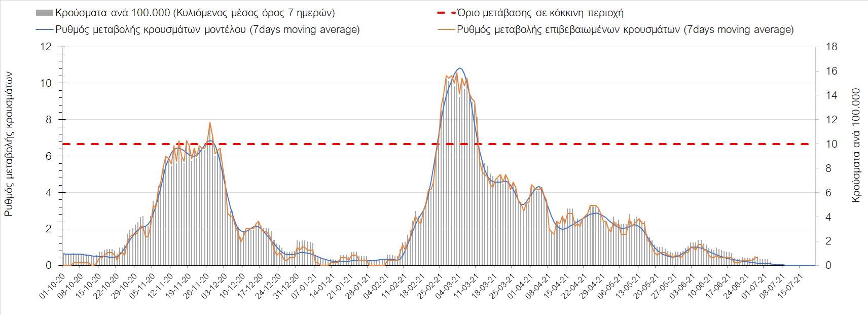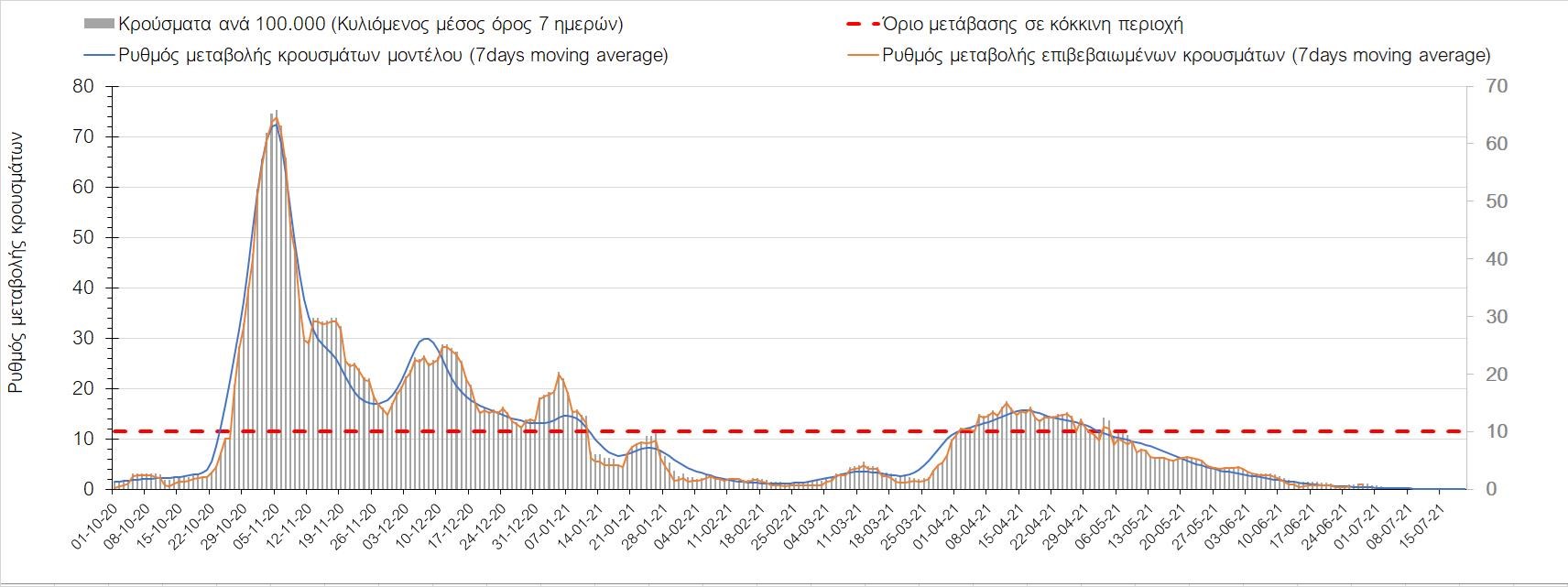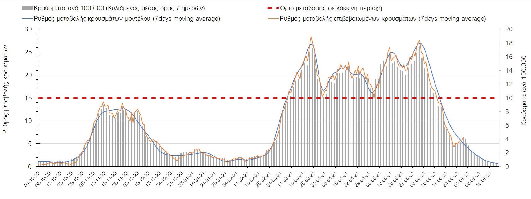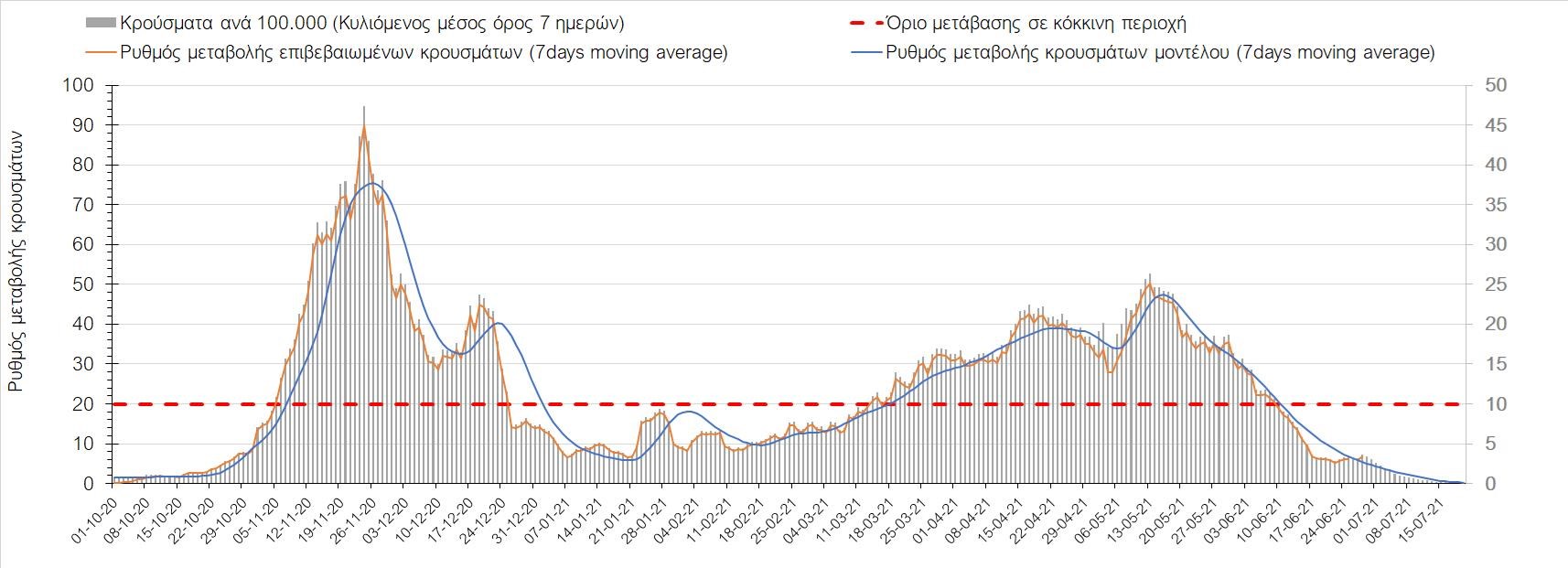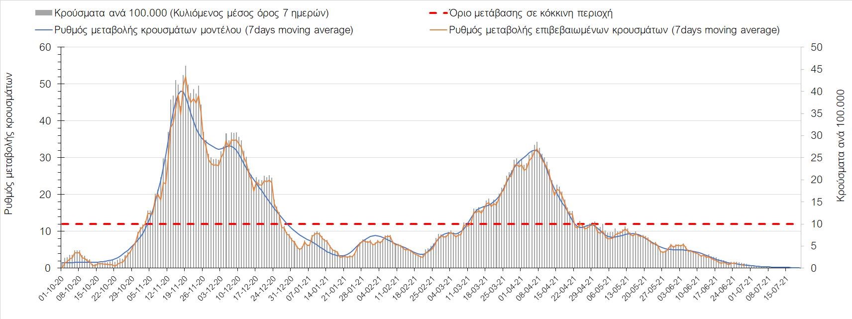 Όσον αφορά επιμέρους περιοχές, όλες πλέον βρίσκονται σε πτωτική πορεία, ενώ με τα τωρινά δεδομένα και λαμβάνοντας υπόψη την αναμενόμενη πορεία, πλέον δεν υφίσταται ανάγκη επιτήρησης για καμία περιφέρεια, με μικρή επιφύλαξη μόνο για το Ρέθυμνο, όπου έχει παρουσιαστεί μια έντονη διακύμανση τις προηγούμενες ημέρες, παρόλο που αναμένουμε να επανέλθει σε πτωτική πορεία. Επίσης, όπως αναφέρθηκε, προβληματίζει η σταθεροποίηση στην Αθήνα, και ο βαθμός που αυτή σχετίζεται με την εξάπλωση μεταλλαγμένων και ταχύτερα μεταδιδόμενων στελεχών (κυρίως το Β.1.1.318 αλλά και το Β.1.617).Με βάση τον υψηλό αριθμό των self-test που πραγματοποιείται τις τελευταίες εβδομάδες, πλέον δεν αναμένουμε αναστροφή της πορείας αποκλιμάκωσης, αρκεί να συνεχιστεί η συμμόρφωση με τα ισχύοντα μέτρα περιορισμού της πανδημίας (χρήση μάσκας και περιορισμοί που αφορούν κυρίως κλειστούς χώρους) και κυρίως η συνέχιση των self-test σε όσο το δυνατόν μεγαλύτερο τμήμα του πληθυσμού (με έμφαση στους εργαζόμενους σε δραστηριότητες με μεγάλο αριθμό ενεργών επαφών). Επίσης, σύμφωνα με τα πιο πρόσφατα στοιχεία που έγιναν διαθέσιμα, ανησυχία πλέον δημιουργεί η αύξηση του ποσοστού διασποράς του μεταλλαγμένου στελέχους Β.1.1.318 σε συγκεκριμένες περιοχές για το 15νθήμερο από 10/05/2021 έως 23/05/2021, όπου οι αντίστοιχες ποσοστώσεις είναι 17.57% για την Αττική, 52.11% για τη Στερεά Ελλάδα, 40% για την Ήπειρο και 19.28% για την Πελοπόννησο, αλλά και η εμφάνιση πλέον στη χώρα της μετάλλαξης Β.1.617. Με δεδομένα τα υπάρχοντα ανοίγματα και την έλευση των τουριστικών ροών είναι ακόμα πιο σημαντική η τήρηση των μέτρων, με κυριότερη την ορθή και μαζική εφαρμογή των self-test, με ταυτόχρονη αύξηση της ιχνηλασίας των επαφών των ανιχνευθέντων ως θετικοί και καραντίνα 14 ημερών για τους συμπολίτες μας που θα επιβεβαιωθεί ότι είναι θετικοί στην μόλυνση με SARS-CoV-2 ακόμη και αν είναι ασυμπτωματικοί. Η σημασία και η αποτελεσματικότητα των self-test και του εμβολιασμού έχει ήδη φανεί τις προηγούμενες 8 εβδομάδες. Με δεδομένη την εμφάνιση της μετάλλαξης Β.1.617 ο πλήρης εμβολιασμός (με δύο δόσεις) του συνολικού πληθυσμού είναι σε συνδυασμό με τη μαζική και συχνή χρήση self-test οι δύο πιο αποτελεσματικές γραμμές άμυνας που έχουμε για να αντιμετωπίσουμε ΑΜΕΣΑ αυτό το πολύ πιο μεταδοτικό στέλεχος του SARS-CoV-2. Σχετικά με το άνοιγμα των συνόρων σε τουριστικές ροές, αυτό θα πρέπει να συνοδευτεί με τα παρακάτω μέτρα:α) εργαστηριακός έλεγχος των ταξιδιωτών τουλάχιστον 48 ώρες πριν την αναχώρηση με δυνατότητα επανάληψης του ελέγχου 7 ημέρες από την άφιξή τους στη χώραβ) πιστοποιητικό ανάρρωσης από την Covid-19 με ημερομηνία μέχρι 6 μήνες πριν την άφιξή τους στη χώρα. γ) δυνατότητα αυξημένου αριθμού rapid test στα τουριστικά θέρετρα της χώρας και όχι μόνο στις πύλες εισόδου.Αν θέλουμε να συνδυάσουμε τη χρηστή διαχείριση του υγειονομικού κινδύνου από την COVID-19 με την εύρυθμη λειτουργία της οικονομίας και της κοινωνίας, είναι κρίσιμο να προετοιμάζουμε κατάλληλα τους χώρους εργασίας, εκπαίδευσης, τα μέσα μαζικής μεταφοράς σε επίπεδα υποδομής ώστε να μπορούν να λειτουργήσουν με αυξημένη ασφάλεια και να μην στηριζόμαστε μόνο στα μέτρα περιορισμού δραστηριοτήτων. Ο περιορισμός δραστηριοτήτων και το lockdown είναι τα τελικά μέτρα που παίρνουμε όταν πρέπει να περιορίσουμε την επέκταση της διασποράς του SARS-CoV-2 δραστικά, δεν μπορεί να είναι τα πρώτα μέτρα που παίρνουμε.
