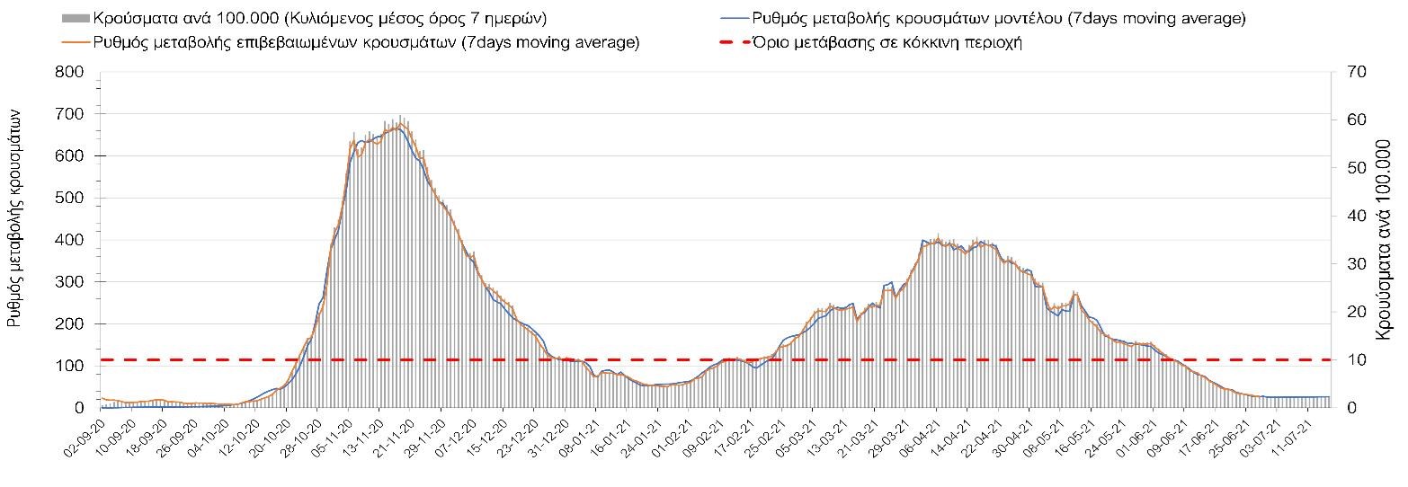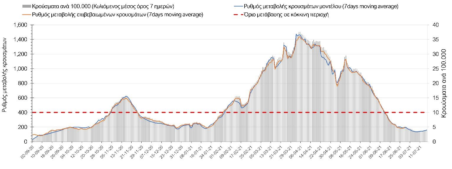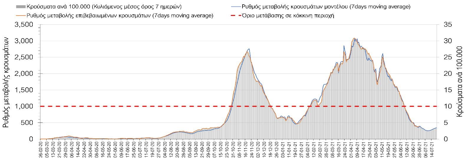 Σχήμα 4. Πορεία του ημερησίου αριθμού των κρουσμάτων (κυλιόμενος μέσος όρος 7 ημερών) στην Ελληνική επικράτεια