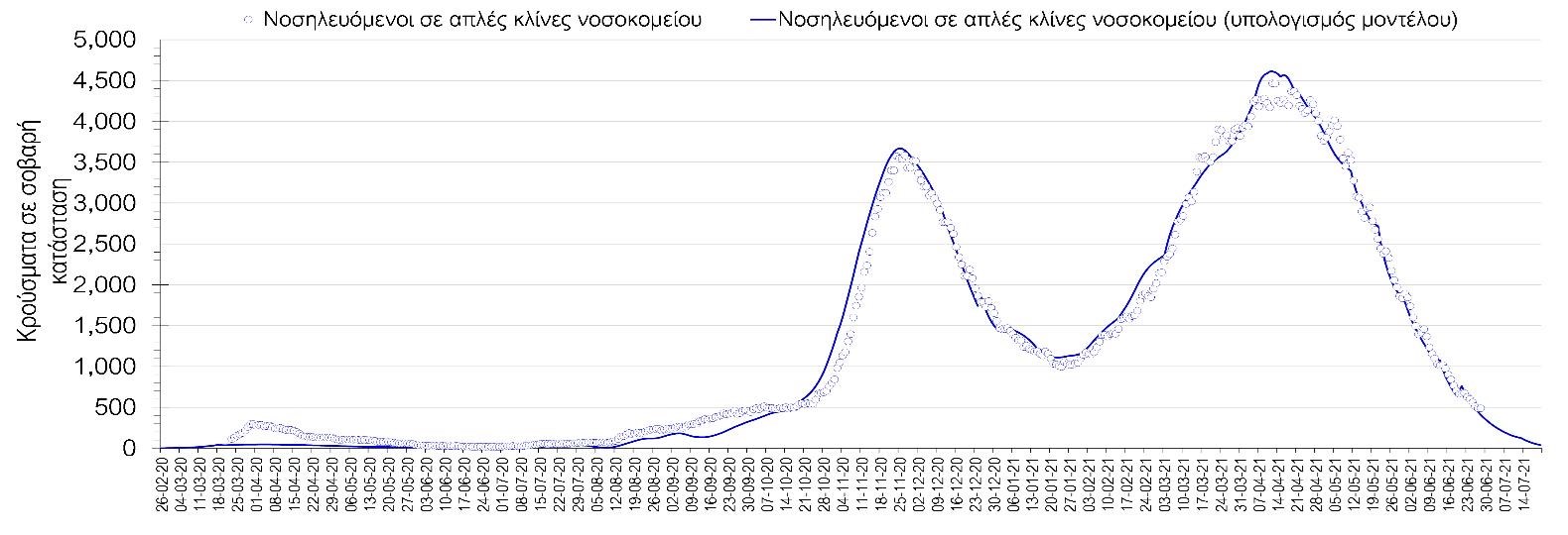 Σχήμα 2. Αριθμός κρουσμάτων σε σοβαρή κατάσταση (νοσηλευόμενοι σε απλές κλίνες) σύμφωνα με τα στοιχεία του ΕΟΔΥ και τις προβλέψεις της υπολογιστικής πλατφόρμας CORE.