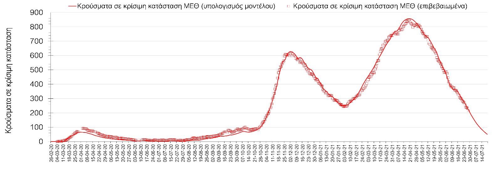 Όσον αφορά στους ασθενείς σε κρίσιμη κατάσταση (διασωληνωμένοι σε ΜΕΘ), ο αριθμός τους μειώθηκε οριακά σε σχέση με την Κυριακή (215 από 231). Παρά τις παρατηρούμενες διακυμάνσεις, συνεχίζεται η αποκλιμάκωση με βάση την επικαιροποιημένη πρόβλεψη. Η καμπύλη εξέλιξης του αριθμού των ασθενών που νοσηλεύονται σε κλίνες ΜΕΘ με βάση τις προσομοιώσεις της πλατφόρμας CORE, όπως αυτή παρουσιάζεται στο Σχήμα 1, των ασθενών που νοσηλεύονται σε απλές κλίνες στο Σχήμα 2, ενώ μια εκτίμηση για την πορεία των θανάτων ανά ημέρα παρουσιάζεται στο Σχήμα 3.