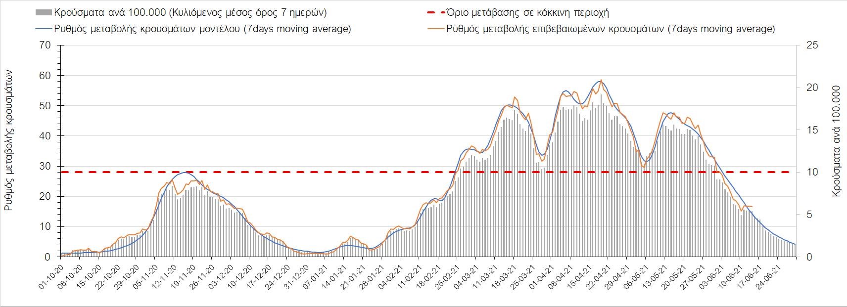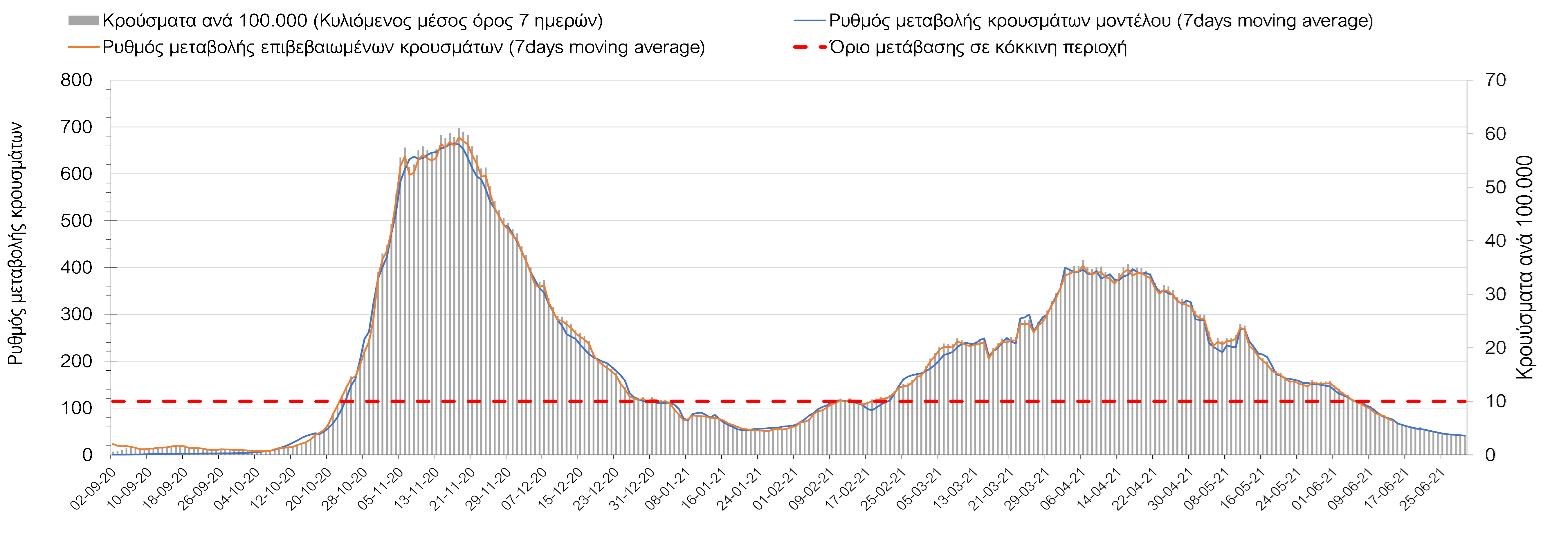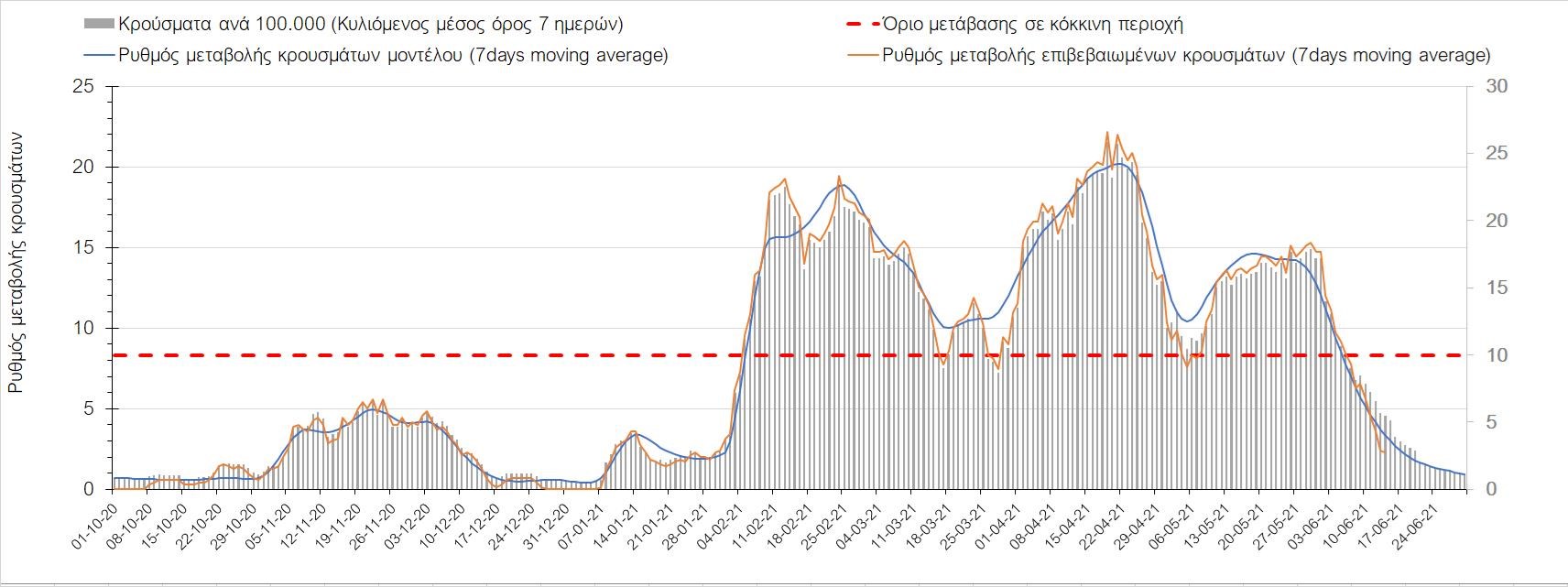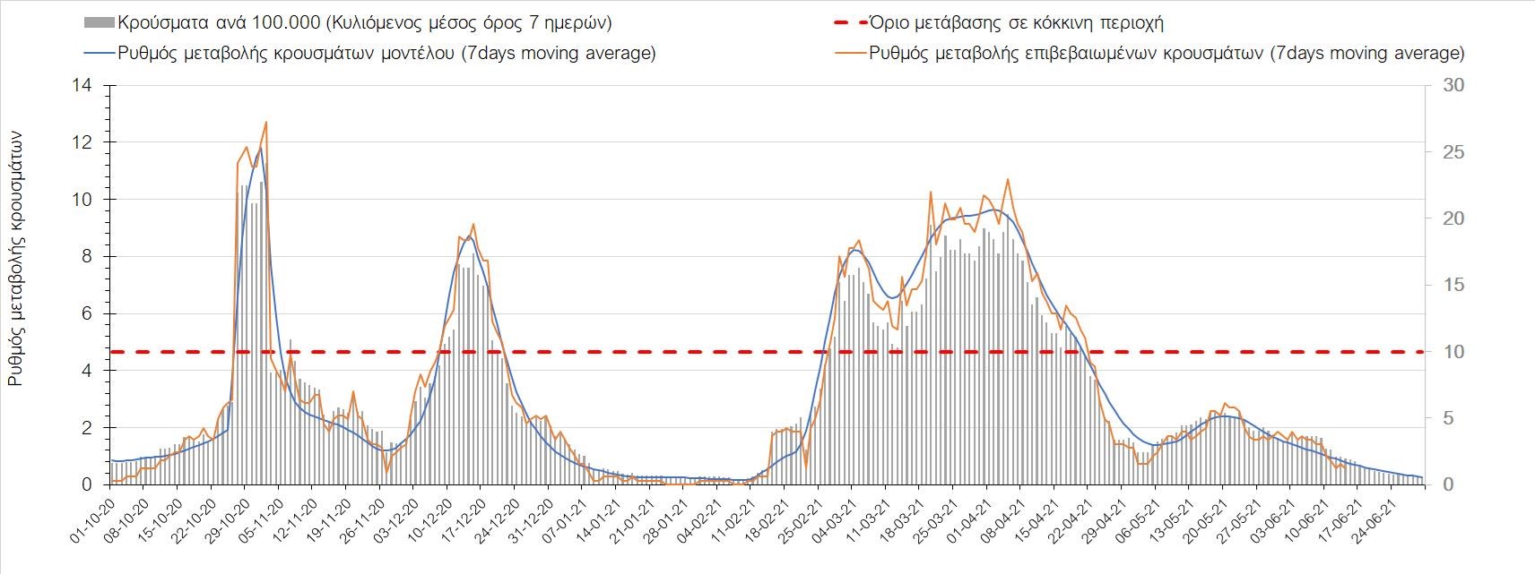 - σε μικρότερο βαθμό η πρόοδος των εμβολιασμών, η σημασία των οποίων στον έλεγχο της πανδημίας θα αρχίσει να είναι πιο εμφανής από το τέλος του Ιουνίου, λαμβάνοντας υπόψιν τη σημαντική αύξηση του ρυθμού εμβολιασμού από τα μέσα Απριλίου, με περίπου 110.000 εμβολιασμούς ημερησίως. Αξίζει να σημειωθεί ότι τις τελευταίες ημέρες παρατηρείται μια επιβράδυνση του ρυθμού εμβολιασμού. Τις επόμενες ημέρες, θα παρουσιάσουμε τις αναθεωρημένες προβλέψεις μας, λαμβάνοντας υπόψη την επιβράδυνση αυτή, οι επιπτώσεις της οποίας θα φανούν μετά τις αρχές Ιουλίου.
