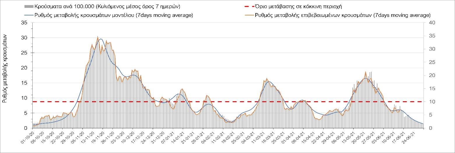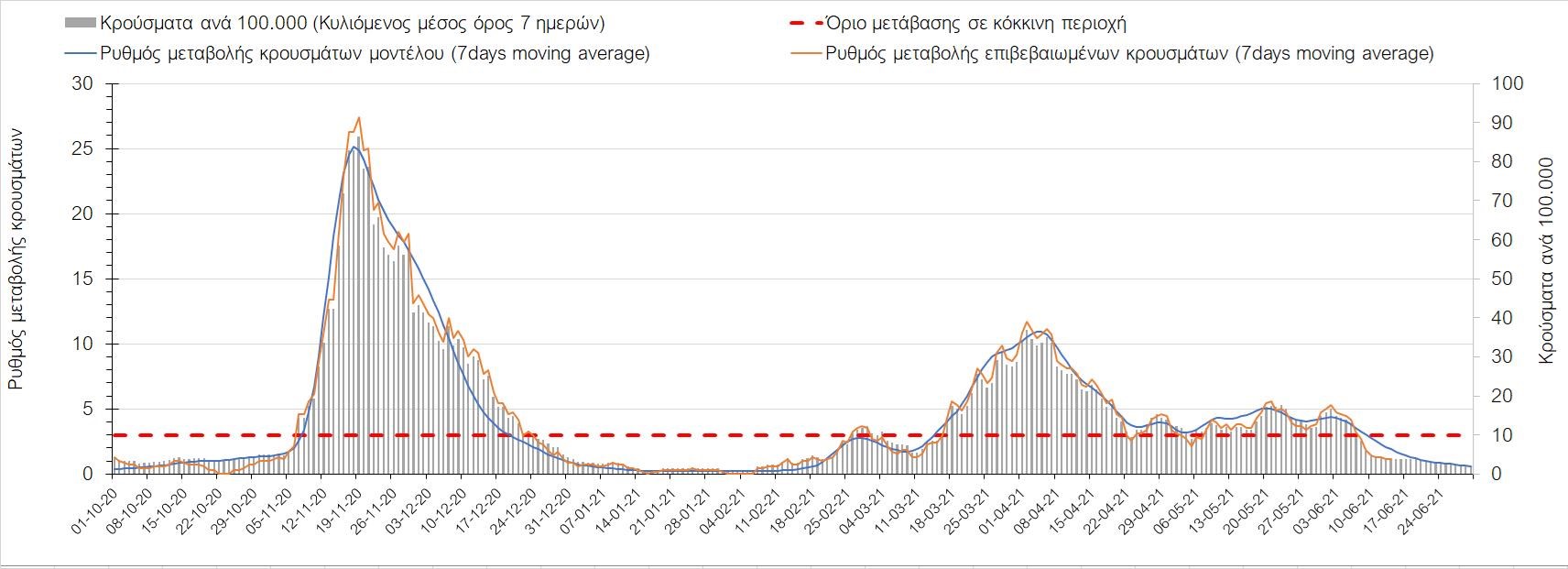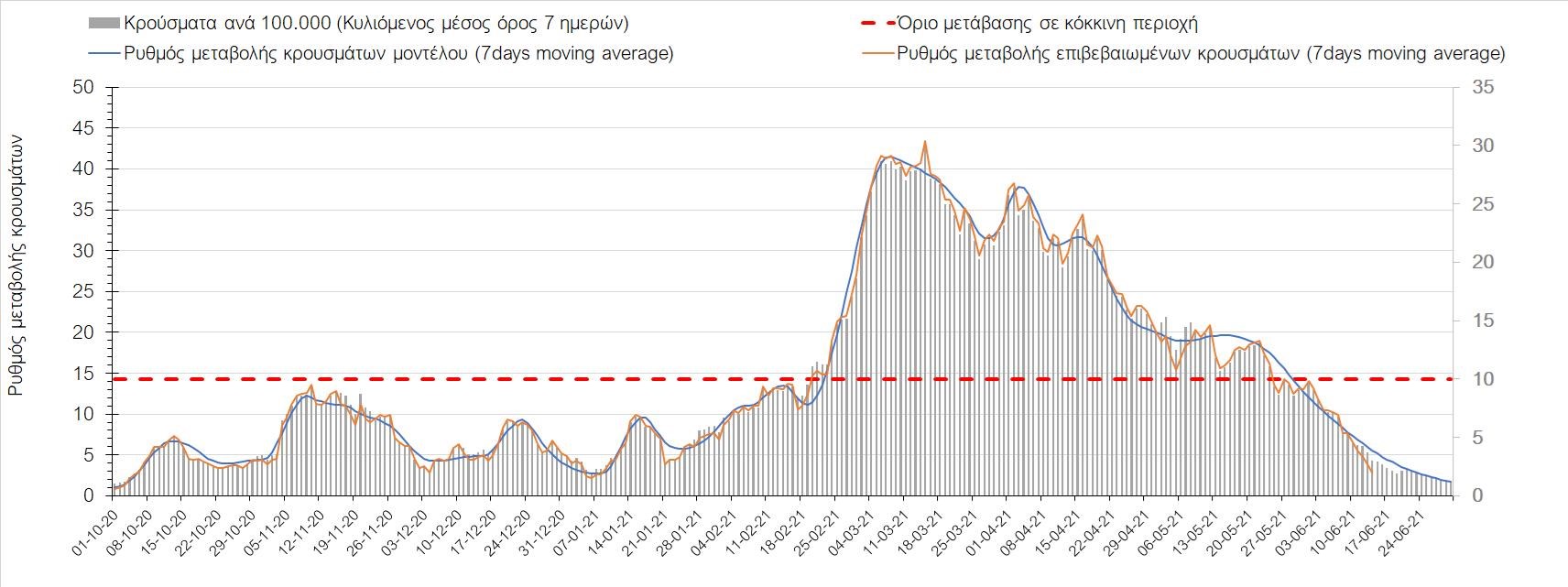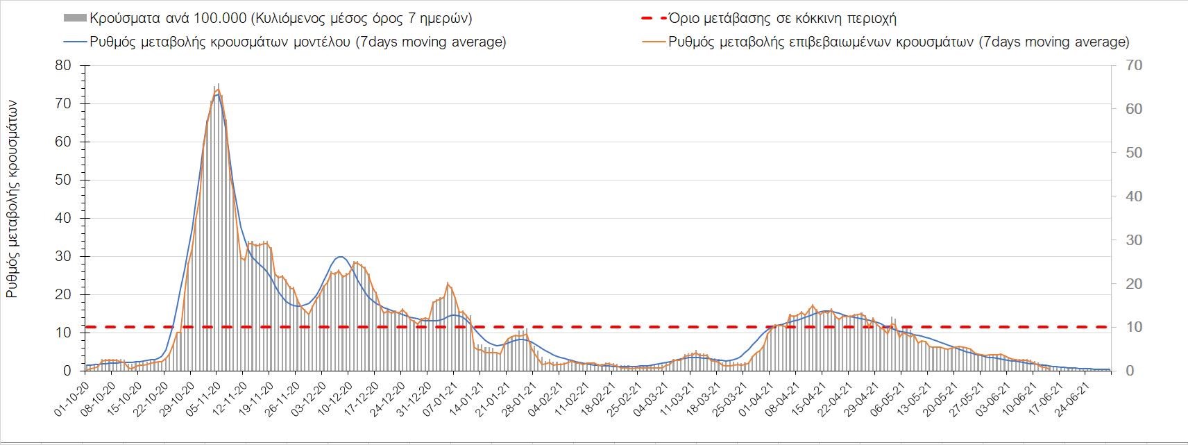 - σε μικρότερο βαθμό η πρόοδος των εμβολιασμών, η σημασία των οποίων στον έλεγχο της πανδημίας θα αρχίσει να είναι πιο εμφανής από το τέλος του Ιουνίου, λαμβάνοντας υπόψιν τη σημαντική αύξηση του ρυθμού εμβολιασμού από τα μέσα Απριλίου, με περίπου 110.000 εμβολιασμούς ημερησίως. Αξίζει να σημειωθεί ότι τις τελευταίες ημέρες παρατηρείται μια επιβράδυνση του ρυθμού εμβολιασμού. Τις επόμενες ημέρες, θα παρουσιάσουμε τις αναθεωρημένες προβλέψεις μας, λαμβάνοντας υπόψη την επιβράδυνση αυτή, οι επιπτώσεις της οποίας θα φανούν μετά τις αρχές Ιουλίου.