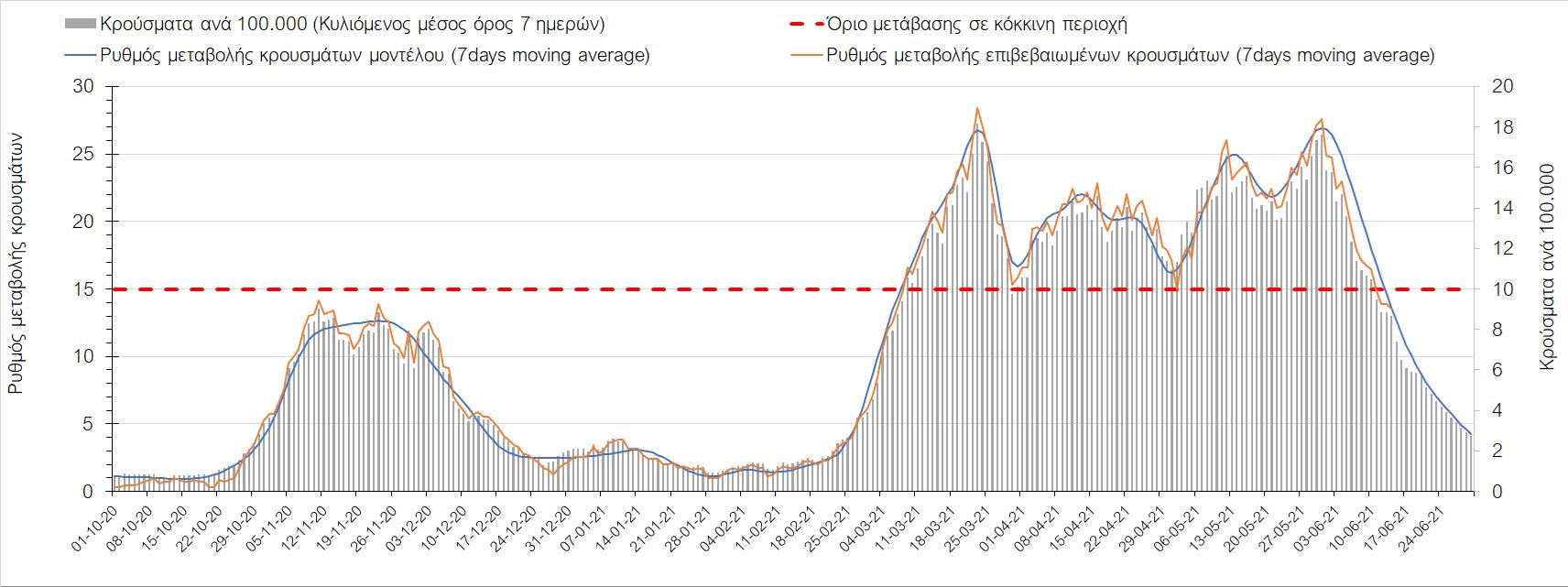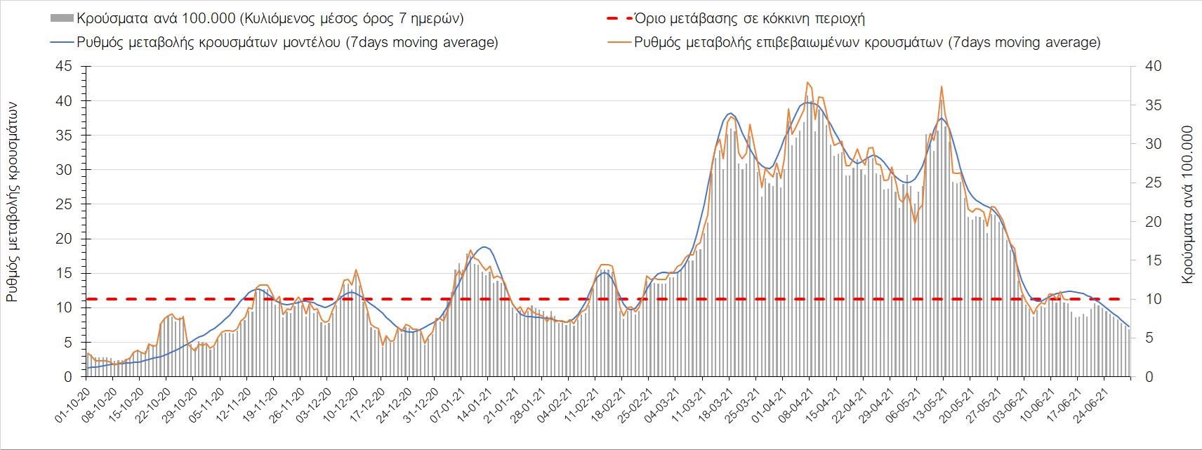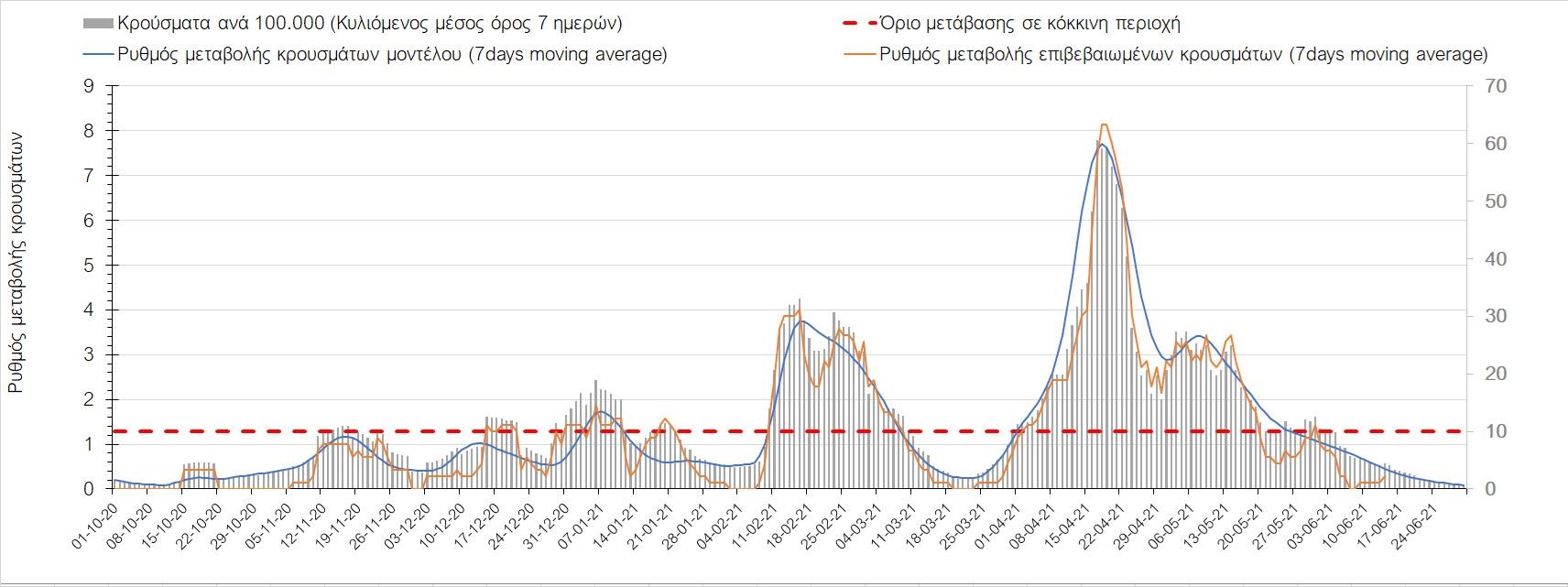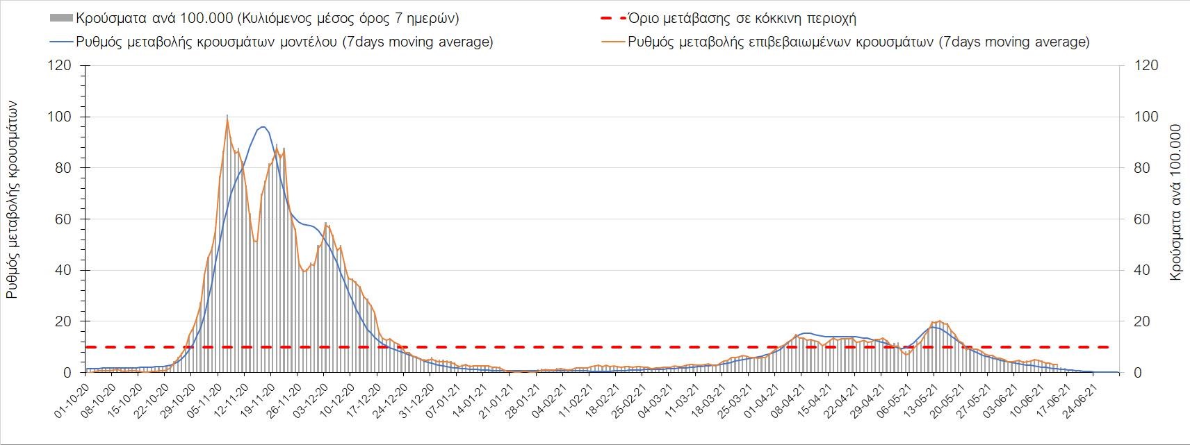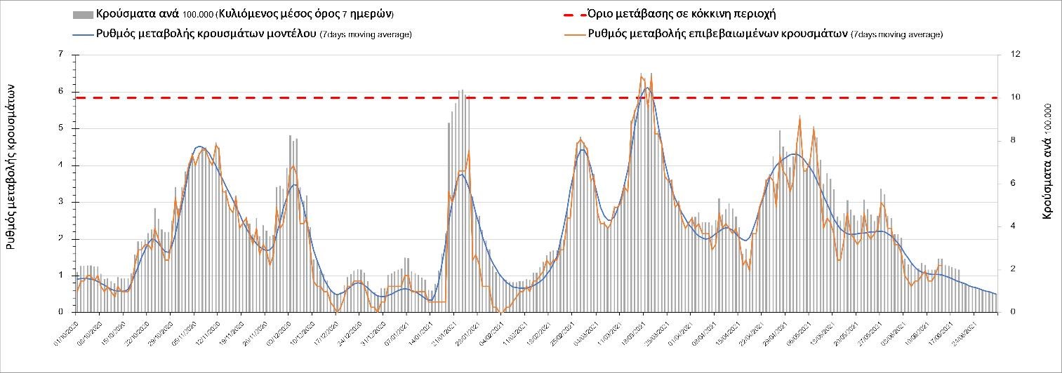 Το enikos.gr καθημερινά, μετά τις ανακοινώσεις του ΕΟΔΥ για τον κορονοϊό παρουσιάζει την ποσοτική ανάλυση των επιδημιολογικών δεδομένων, σε συνεργασία με την ομάδα του Δημοσθένη Σαρηγιάννη, διευθυντή του Εργαστηρίου Περιβαλλοντικής Μηχανικής του Αριστοτελείου Πανεπιστημίου Θεσσαλονίκης και διευθυντή της Ερευνητικής Ομάδας HERACLES για το Εκθεσίωμα και την Ανθρώπινη Υγεία του Κέντρου Διεπιστημονικής Έρευνας και Καινοτομίας του ΑΠΘ. Σύμφωνα με την εκτίμηση του, η Αττική είναι στο όριο ώστε να πέσει ο εβδομαδιαίος μέσος όρος κάτω από τα 10 κρούσματα ανά 100.000 κατοίκους.