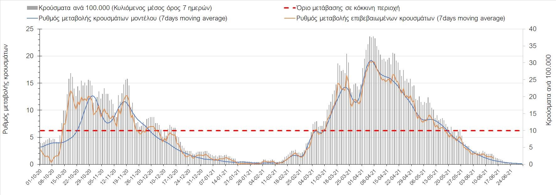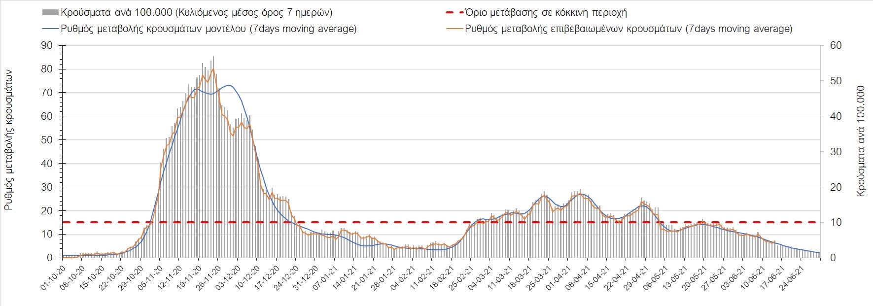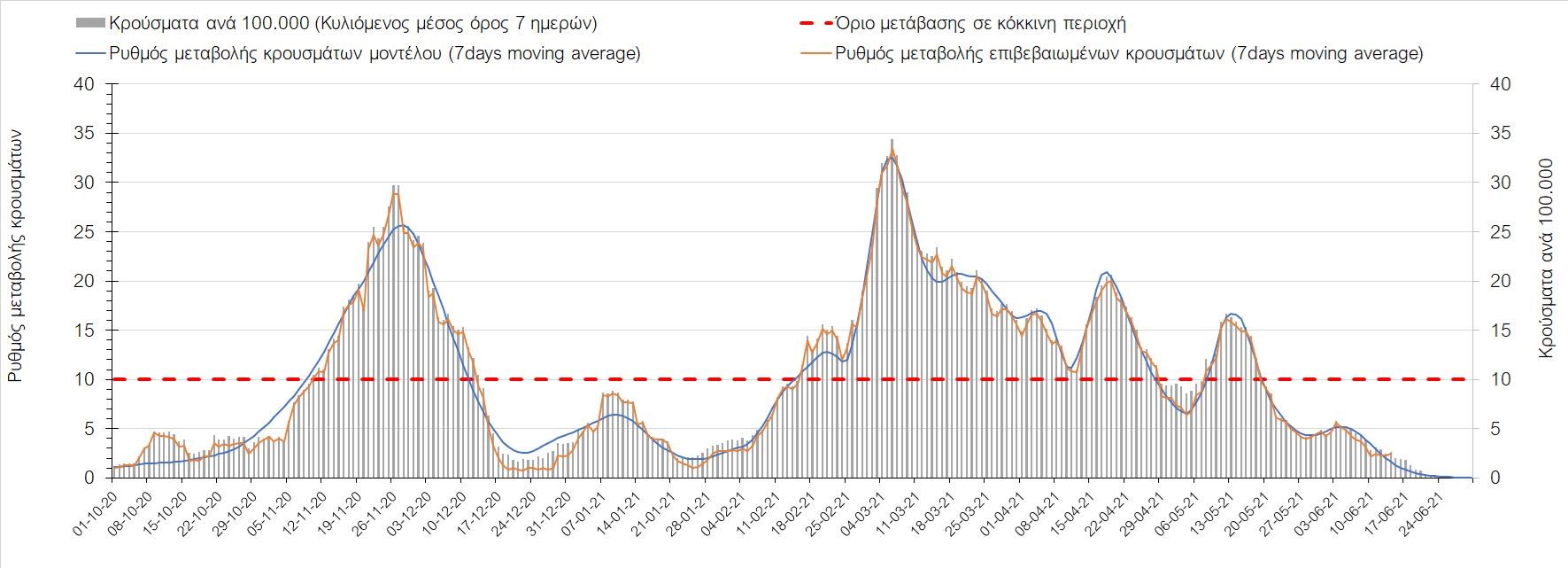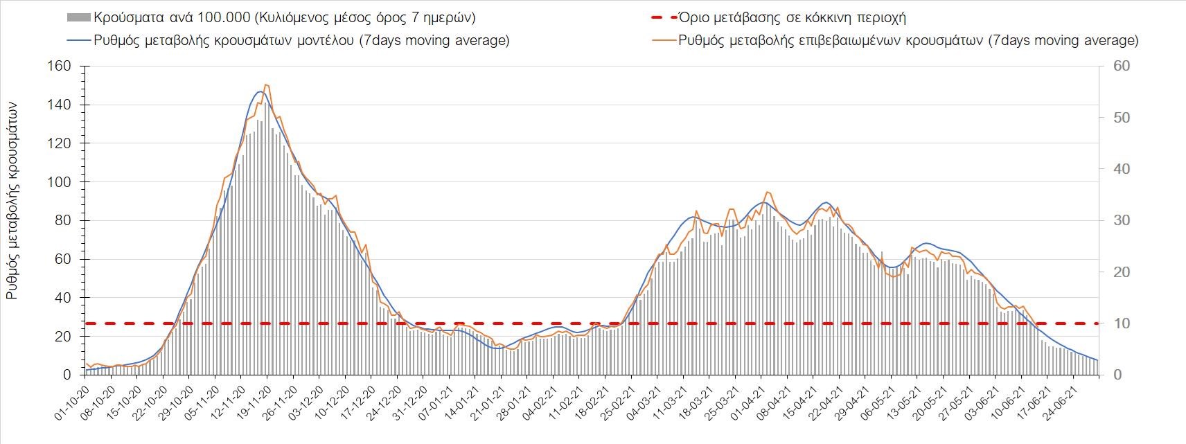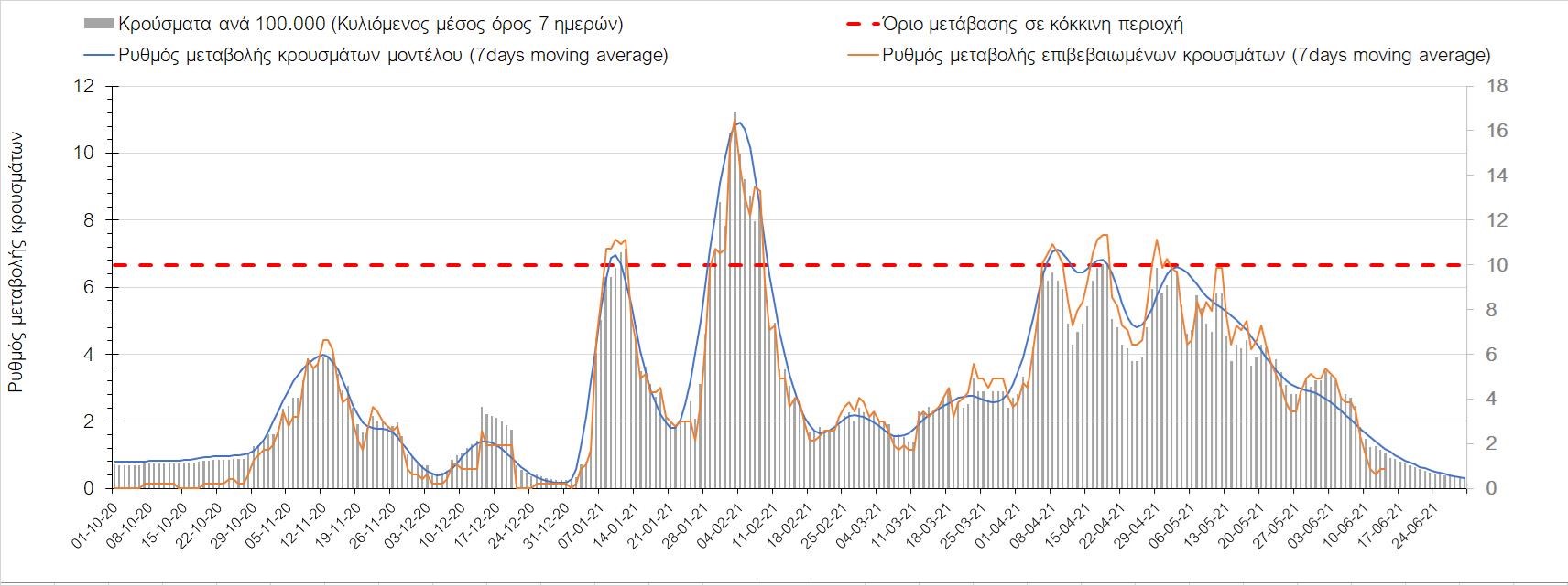 Το enikos.gr καθημερινά, μετά τις ανακοινώσεις του ΕΟΔΥ για τον κορονοϊό παρουσιάζει την ποσοτική ανάλυση των επιδημιολογικών δεδομένων, σε συνεργασία με την ομάδα του Δημοσθένη Σαρηγιάννη, διευθυντή του Εργαστηρίου Περιβαλλοντικής Μηχανικής του Αριστοτελείου Πανεπιστημίου Θεσσαλονίκης και διευθυντή της Ερευνητικής Ομάδας HERACLES για το Εκθεσίωμα και την Ανθρώπινη Υγεία του Κέντρου Διεπιστημονικής Έρευνας και Καινοτομίας του ΑΠΘ. Σύμφωνα με την εκτίμηση του, η Αττική είναι στο όριο ώστε να πέσει ο εβδομαδιαίος μέσος όρος κάτω από τα 10 κρούσματα ανά 100.000 κατοίκους.
