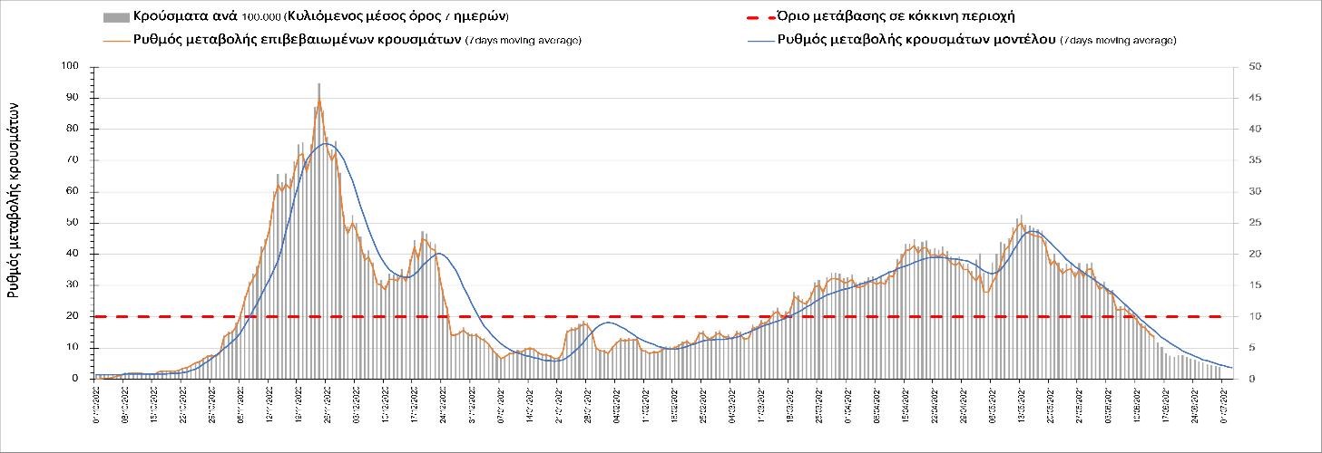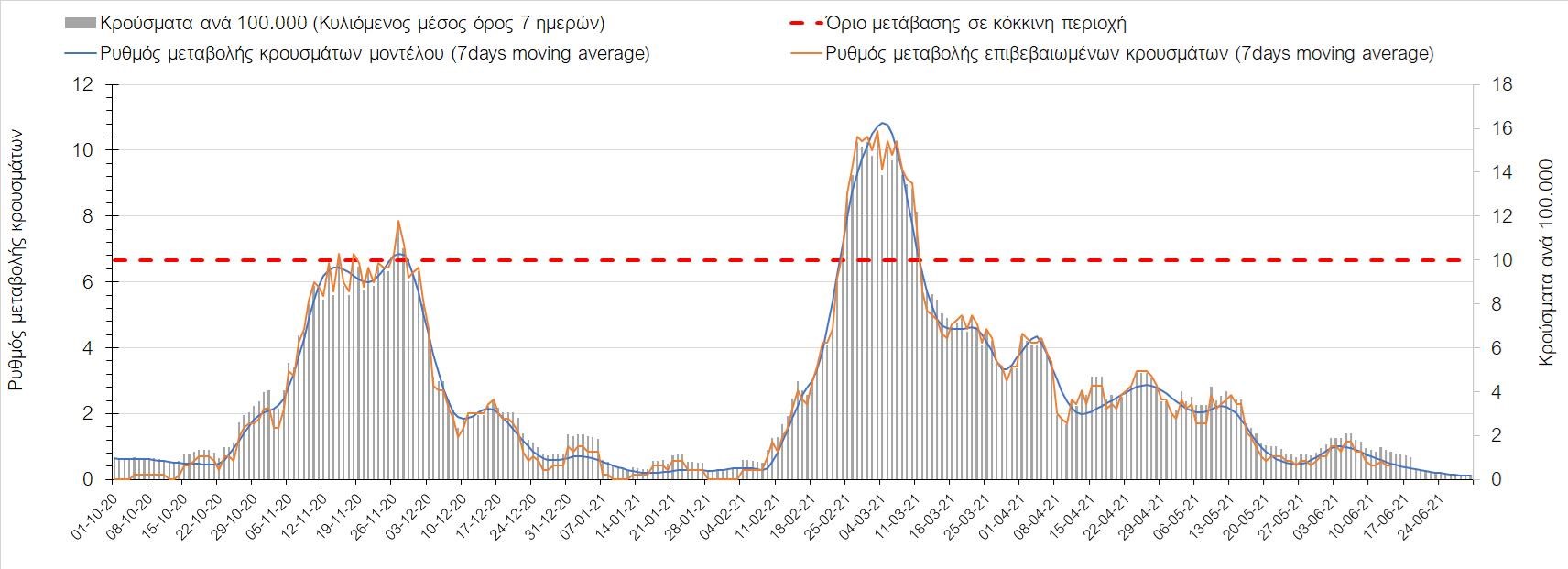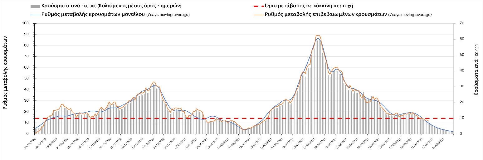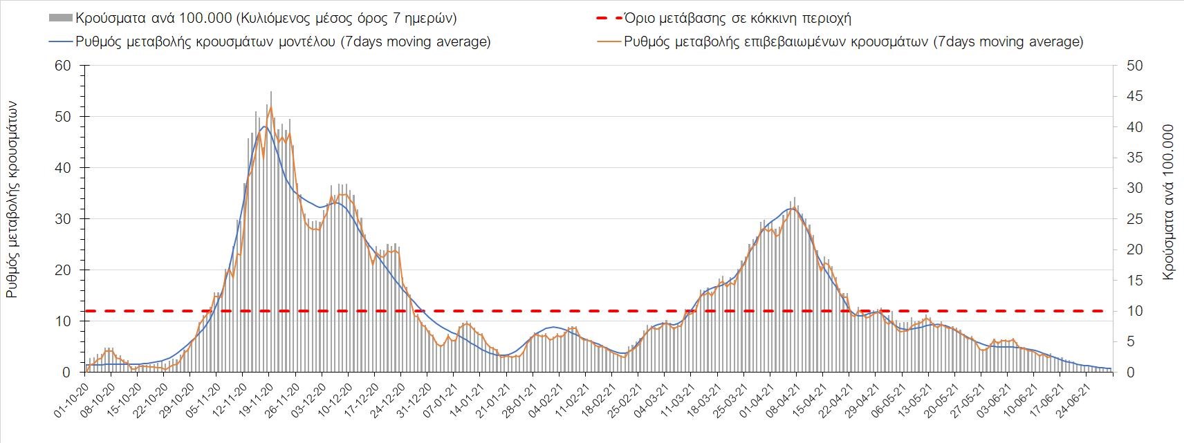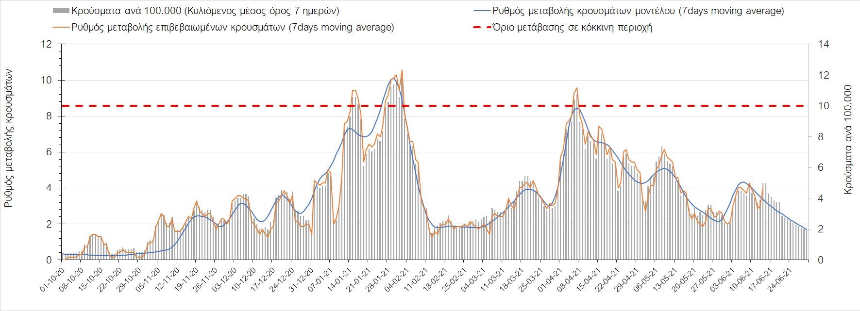 Το enikos.gr καθημερινά, μετά τις ανακοινώσεις του ΕΟΔΥ για τον κορονοϊό παρουσιάζει την ποσοτική ανάλυση των επιδημιολογικών δεδομένων, σε συνεργασία με την ομάδα του Δημοσθένη Σαρηγιάννη, διευθυντή του Εργαστηρίου Περιβαλλοντικής Μηχανικής του Αριστοτελείου Πανεπιστημίου Θεσσαλονίκης και διευθυντή της Ερευνητικής Ομάδας HERACLES για το Εκθεσίωμα και την Ανθρώπινη Υγεία του Κέντρου Διεπιστημονικής Έρευνας και Καινοτομίας του ΑΠΘ. Σύμφωνα με την εκτίμηση του, η Αττική είναι στο όριο ώστε να πέσει ο εβδομαδιαίος μέσος όρος κάτω από τα 10 κρούσματα ανά 100.000 κατοίκους.