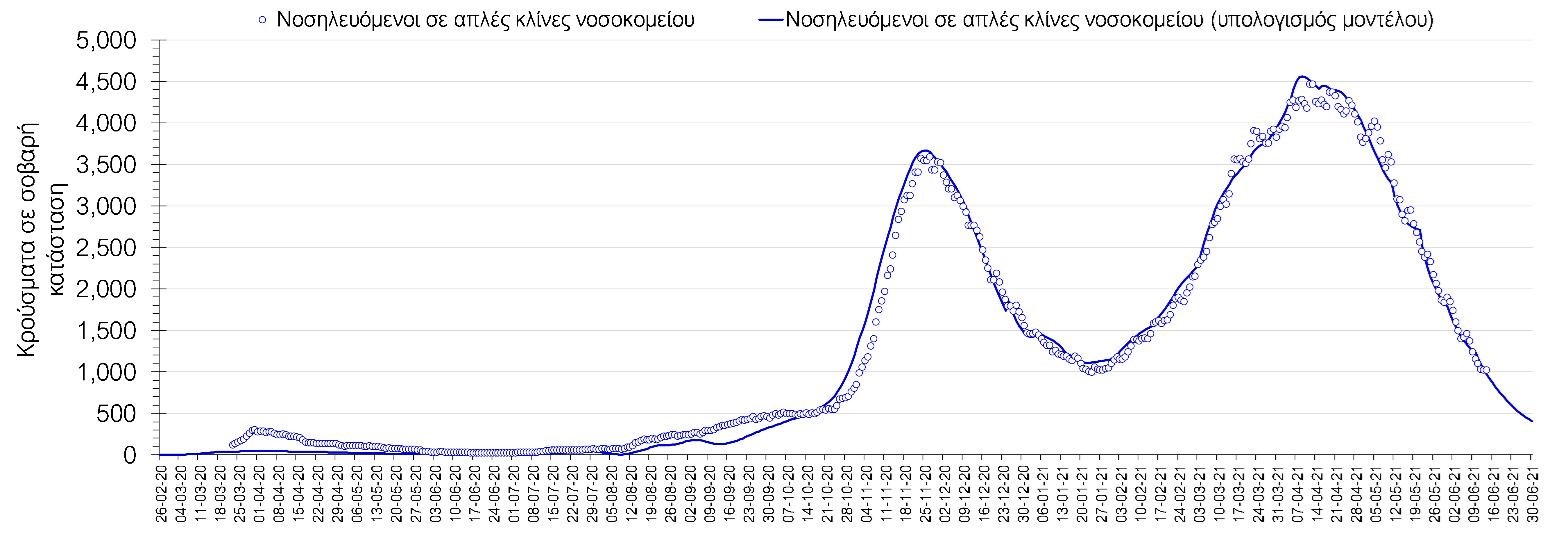 Σχήμα 2. Αριθμός κρουσμάτων σε σοβαρή κατάσταση (νοσηλευόμενοι σε απλές κλίνες) σύμφωνα με τα στοιχεία του ΕΟΔΥ και τις προβλέψεις της υπολογιστικής πλατφόρμας CORE.