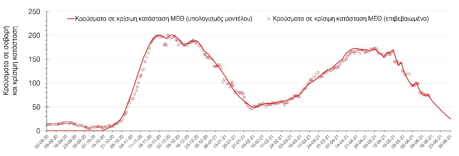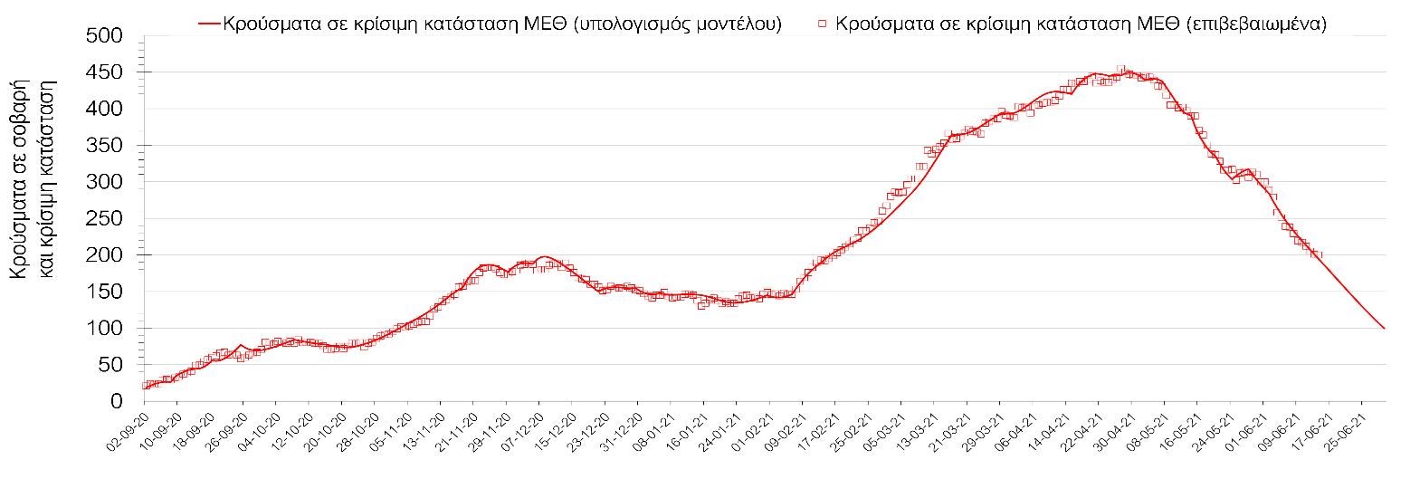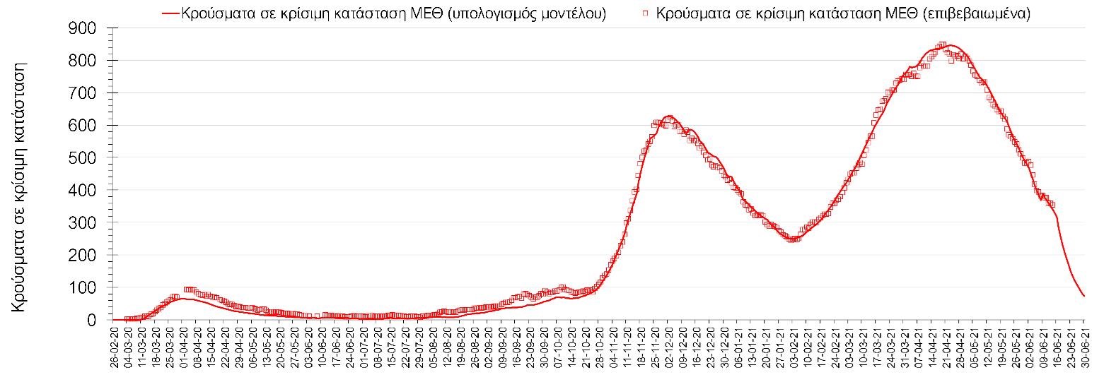 Σχήμα 1. Αριθμός κρουσμάτων σε κρίσιμη κατάσταση (ΜΕΘ) σύμφωνα με τα στοιχεία του ΕΟΔΥ και τις προβλέψεις της υπολογιστικής πλατφόρμας CORE.