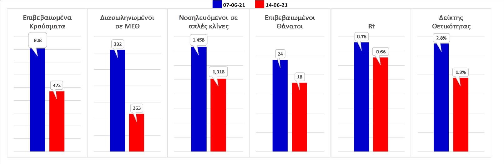 Σχήμα 53. Συγκριτικά αποτελέσματα της επιδημιολογικής εικόνας της Δευτέρας (14/6/2021) σε σχέση με την προηγούμενη (7/6/2021)